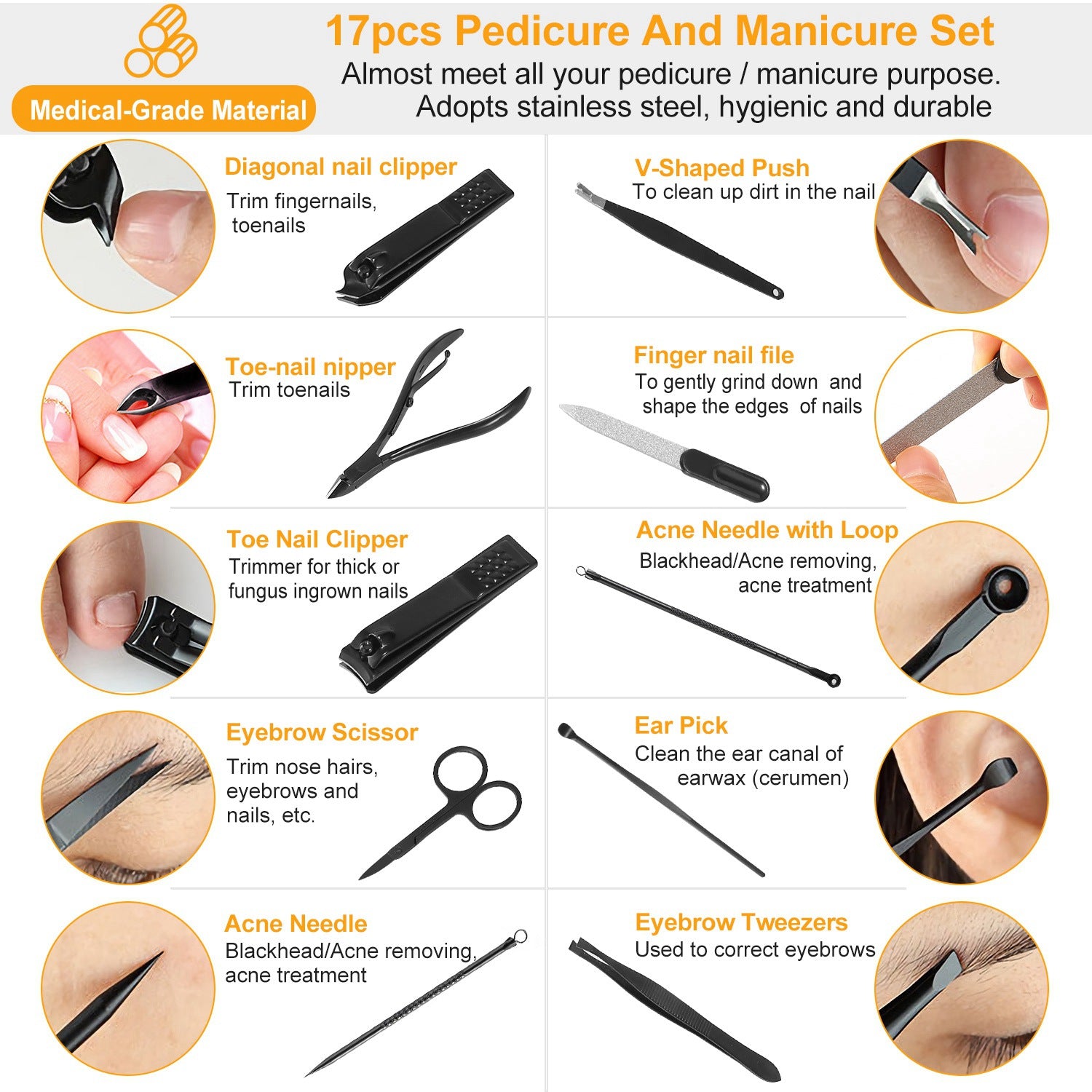 17PCS Multi-Functional Care Set: - Includes 17 essential tools for nail, toenail, hand, facial, and foot care.