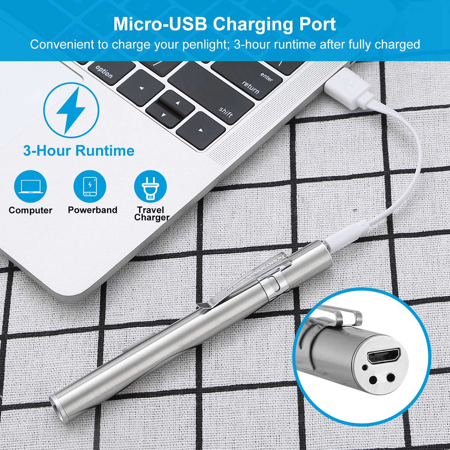 This portable penlight is designed for both everyday use and professional applications, offering 250 lumens of brightness for clear visibility in low-light environments. Compact and lightweight, it can easily fit in your pocket or be clipped to your clothing for convenient carrying. With a durable stainless steel body, water resistance, and USB rechargeability, it’s ideal for both medical and personal use, making it a versatile tool for nurses, doctors, and anyone in need of a reliable flashlight.