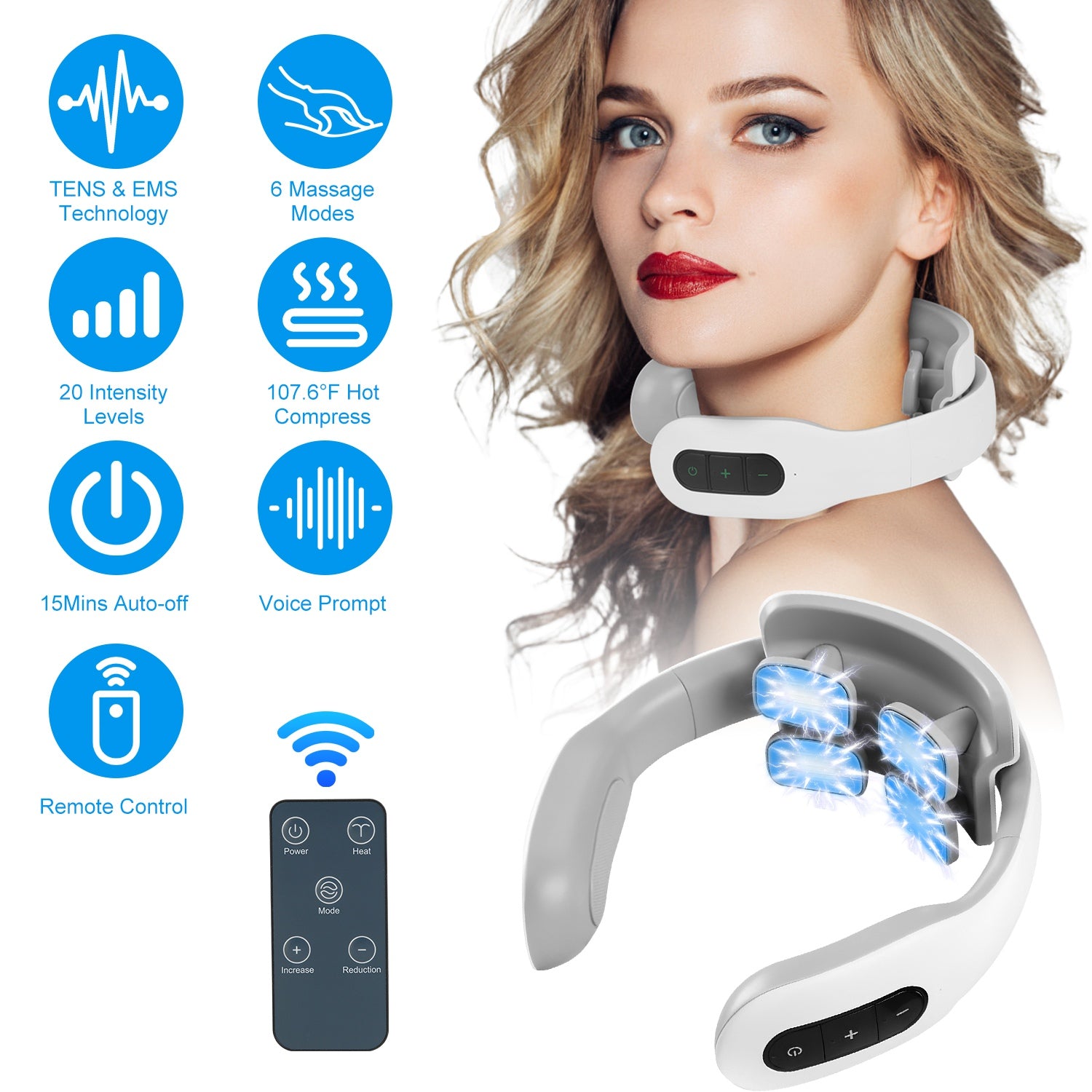 Enjoy a soothing and effective massage with this heated neck massager, designed to relieve cervical spine pain and muscle tension. Featuring 6 massage modes, 20 intensity levels, and advanced TENS & EMS technology, it delivers a deep tissue massage tailored to your comfort. The 42°C (107.6°F) hot compress further enhances relaxation, while the cordless, rechargeable design makes it perfect for home, office, or travel use.