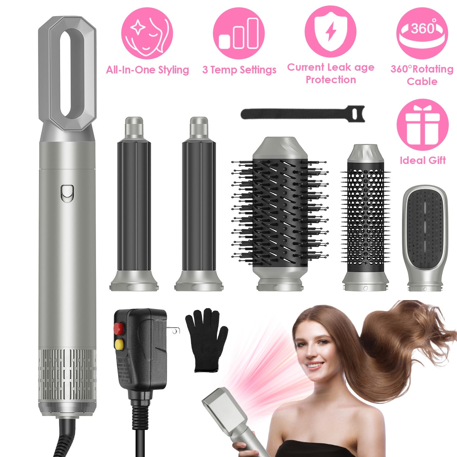 Includes 6 interchangeable heads for drying, straightening, curling (left and right), and volumizing. Perfect for styling straight, wavy, curly hair, curly bangs, and more.