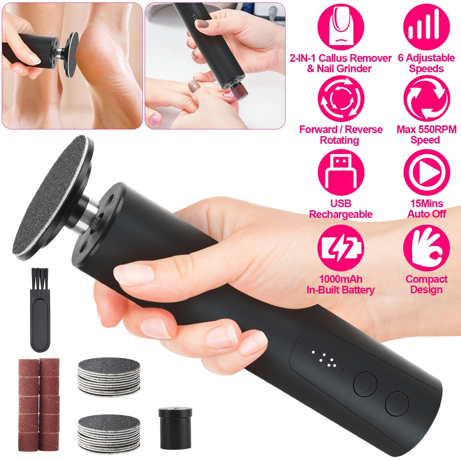 2-in-1 Design: Includes a callus remover head for feet and a nail polishing head, easily interchangeable for versatile use