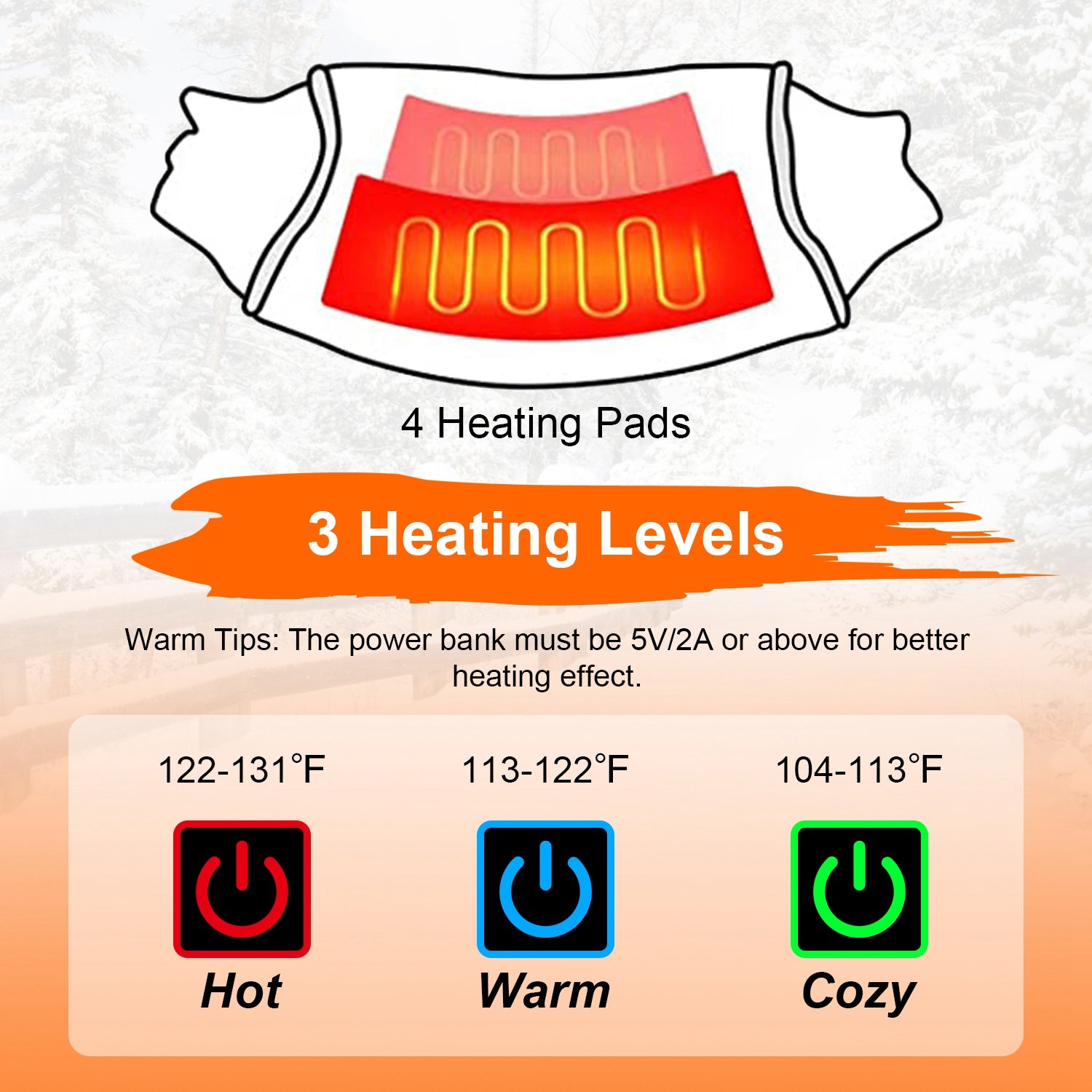 - 3 Heating Levels: Adjustable temperatures (122-131℉/113-122℉/104-113℉) with embedded 4 heating pads to keep your hands warm in cold weather.
