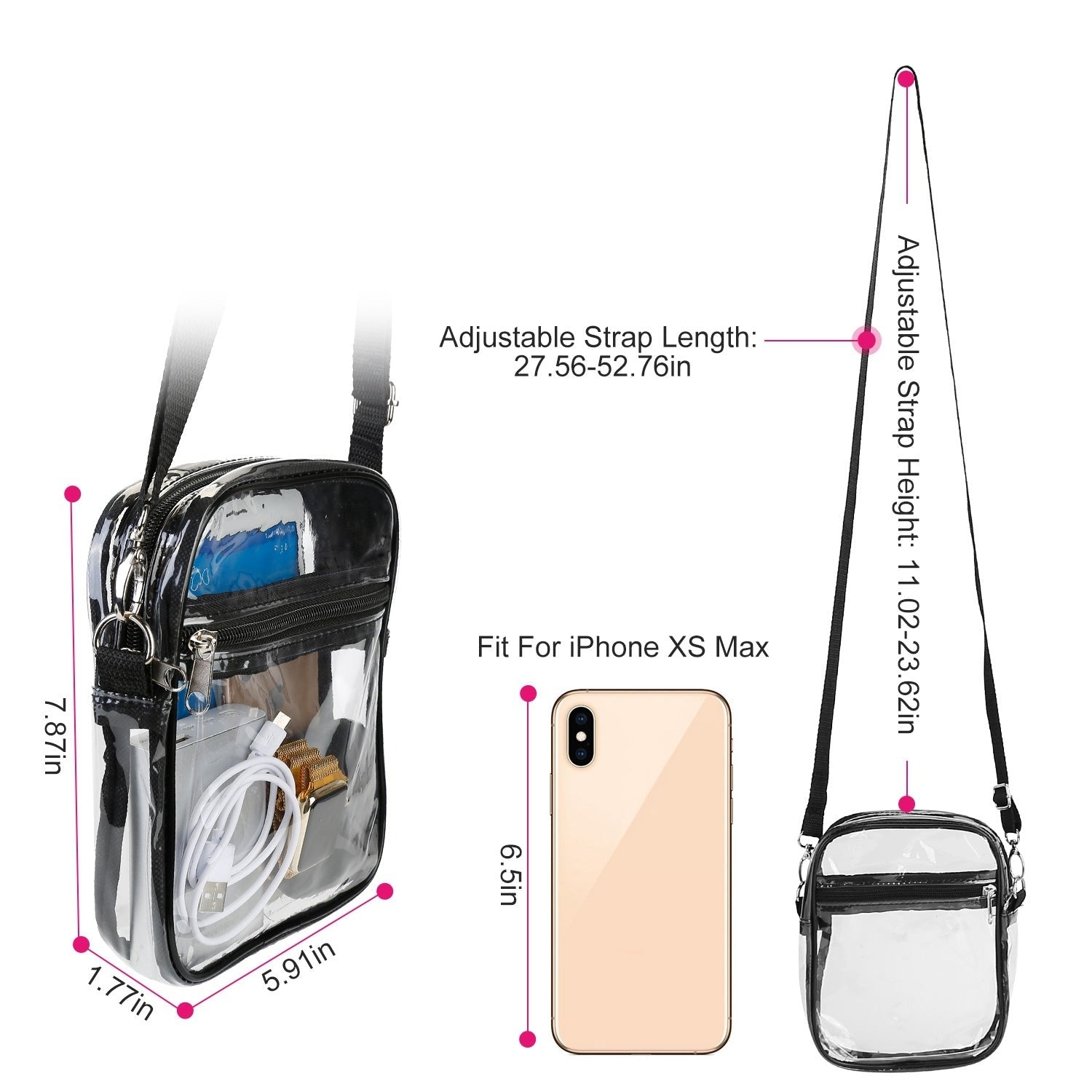 Stay organized and stylish with this clear cross-body bag, designed for practicality and convenience. Measuring 7.87 x 5.91 x 1.77 inches, it's spacious enough to store your phone, wallet, and cosmetics, with an extra front pocket to keep smaller items like keys, cash, cards, and tickets neatly arranged.
