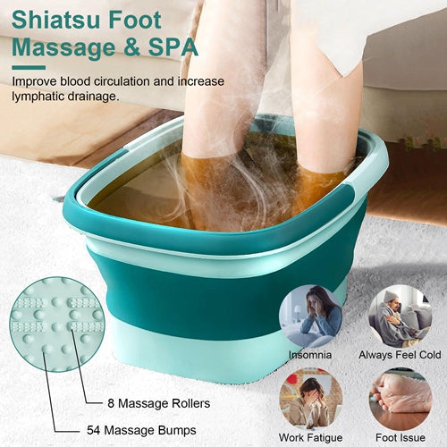 Experience ultimate relaxation with our comfortable foot massager, featuring eight massage rollers and 54 massage bumps on the bottom. This foldable foot tub offers a soothing Shiatsu massage that helps remove dead skin, improves blood circulation, and alleviates fatigue from your busy day. Enhance your experience by adding foot soak salts or lymphatic drainage ginger to the warm water for an extra touch of comfort.