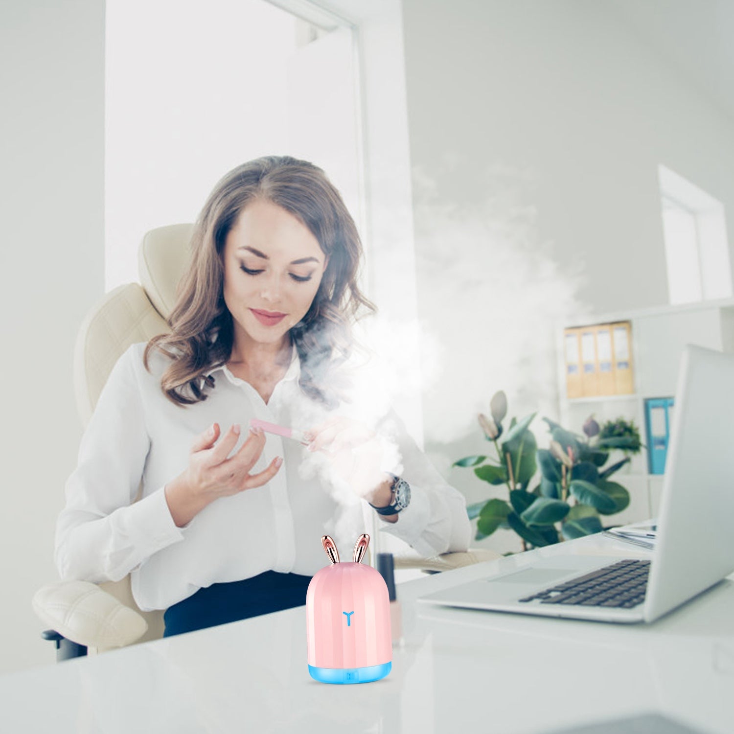 Our ultrasonic air humidifier utilizes advanced ultrasonic technology to produce a finer mist with ultra-low noise (36dB), ensuring your work or rest remains undisturbed. With a 220ml water tank and a mist output of 50ml/h, it can run continuously for up to 4 hours before automatically shutting off when the water runs out. Featuring 7 changeable LED colors, this humidifier creates a romantic atmosphere that helps promote restful sleep. The diffuser also emits light for 1 hour and has an auto-off function. Its low power consumption ensures energy efficiency, while nano-water molecules hydrate your skin, prevent dryness, and help protect against stuffy air and germs. Powered via a USB cable, it’s easy to take on the go.