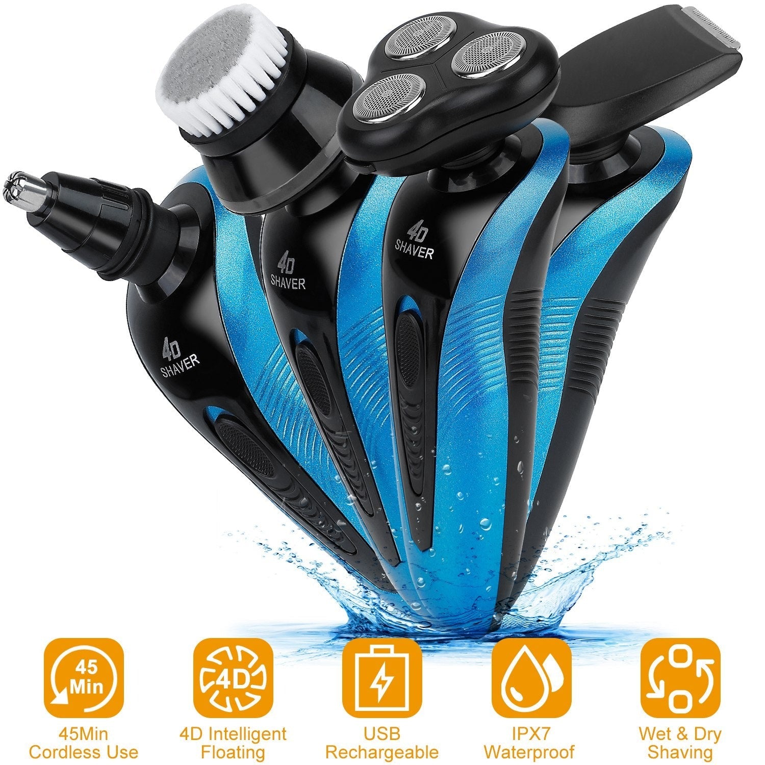 - Includes 4 detachable heads: electric razor, beard trimmer, nose trimmer, and facial cleaning brush.