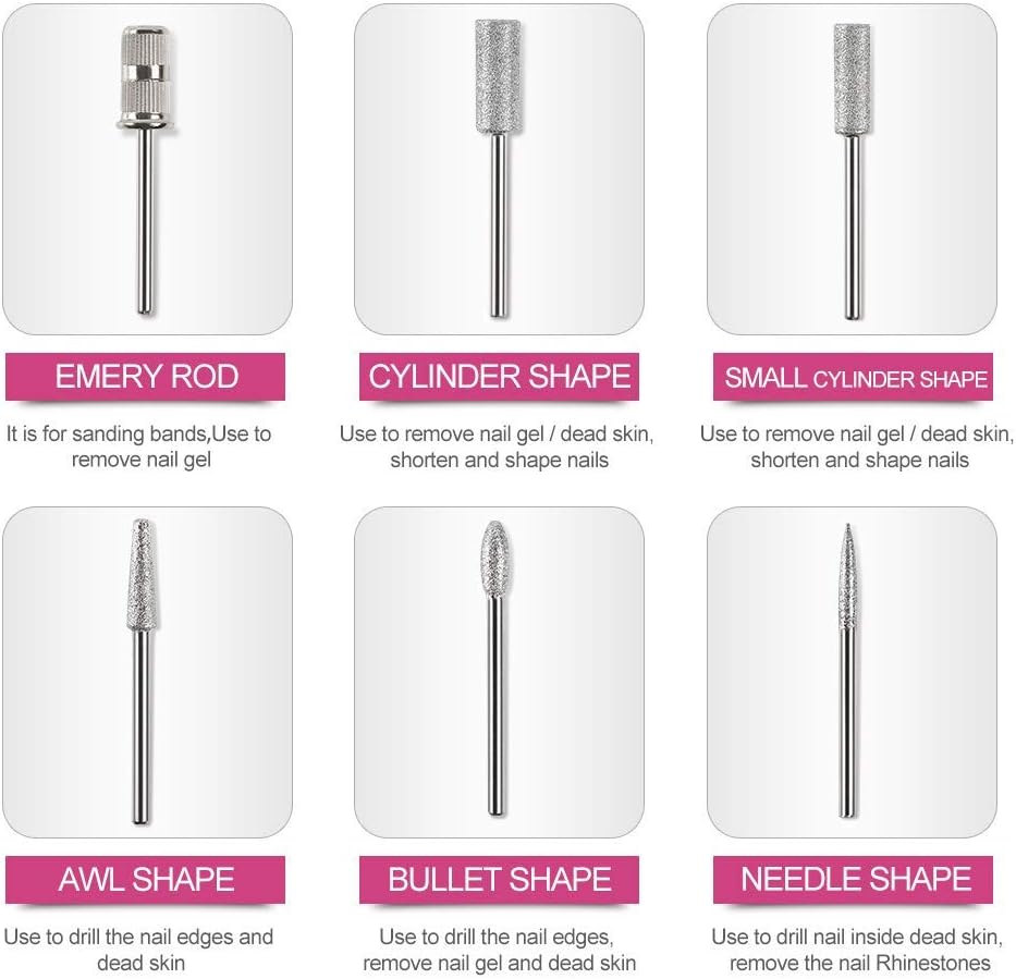 - Multipurpose: Designed with 6 kinds of metal bits and 6 sanding bands, which are used for grinding, carving, cutting, and polishing for all nail arts as well as cuticle removal. Applicable to natural nails or artificial nails.