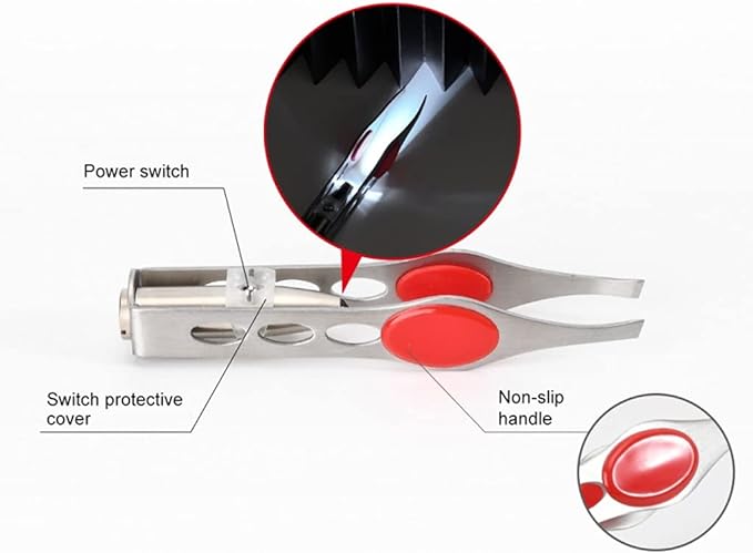 Tired of struggling to find the perfect lighting while removing unwanted hair during your makeup routine? Our LED tweezer solves that problem! Equipped with a built-in LED light, it ensures you can clearly see the hair, making removal easier and more precise. Crafted from durable stainless steel, this tweezer is sturdy, sharp, and long-lasting. Step into the future of grooming—get yours today!