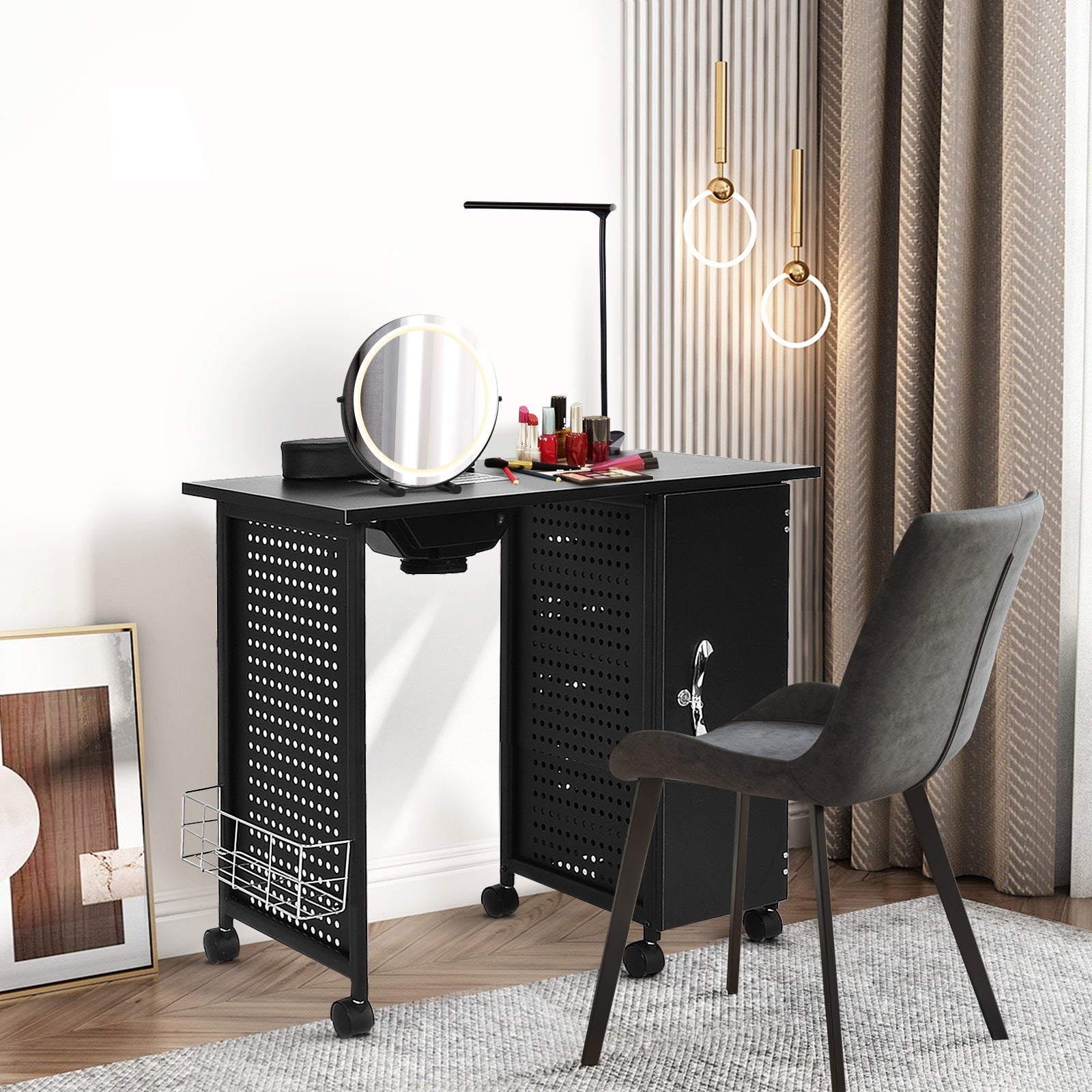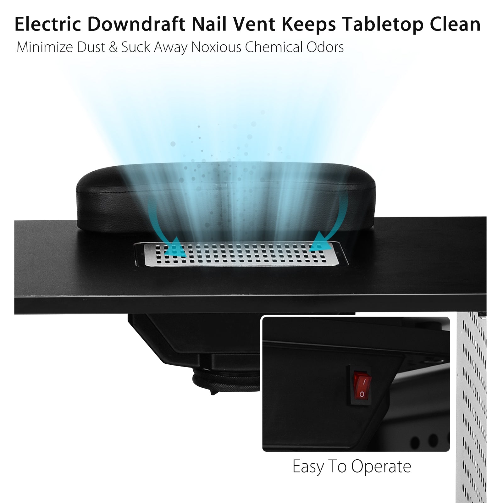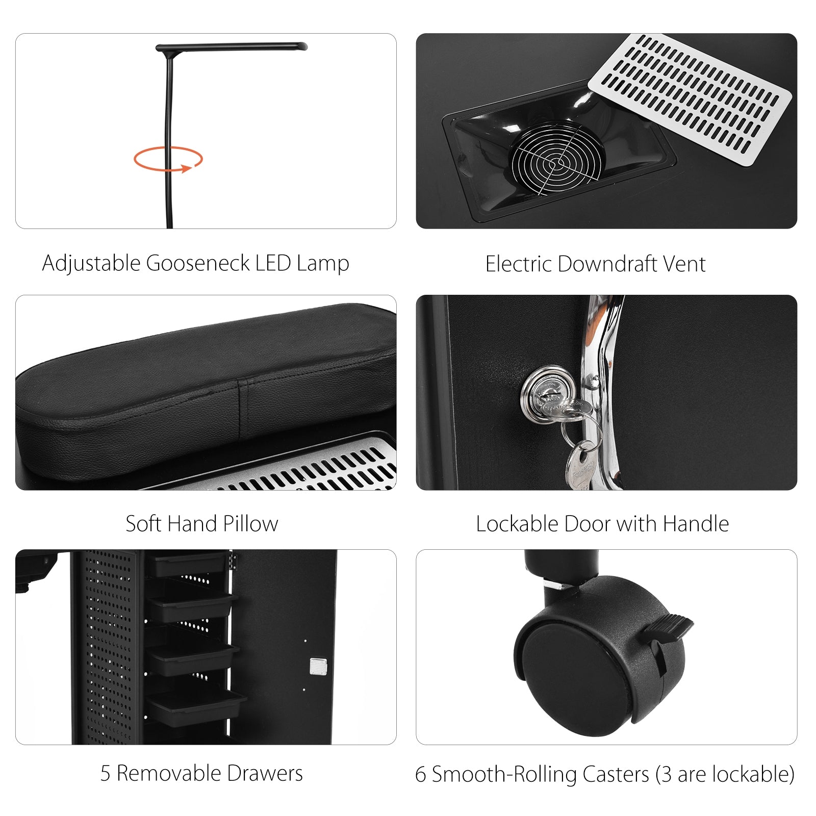 This deluxe steel-frame manicure table is exactly what you need for nail beauty at your upscale salon or home. Built by sturdy steel and premium MDF this classic black nail table ensures lasting usage great stability and durability. The cabinet with 5 removable drawers provides you with ample storage space for keeping your items in order. Equipped with a safety lock this storage cabinet can protect your personal stuff and also prevent kids from opening it by accident. The electric downdraft vent can reduce dust and suck away chemical odors. Soft twist cushions and bright lamp offer you a better nail beauty experience. You can effortlessly move the table as needed and stop it with brake. The functional nail workstation is perfect for personal use and professional mobile salon. Electric downdraft nail vent minimizes dust and reduces fumes 5 removable drawers with lock and keys keep accessories well organized 6 caster wheels allow easy mobility & stop easily with brake Bright lamp with adjustable gooseneck & clip-on design The wrist rest offers you comfort and convenience while shaping nails Side metal basket with great load capacity for easy access Smooth and durable MDF tabletop for lasting usage & easy cleaning Black steel frame ensures sturdy support & great stability