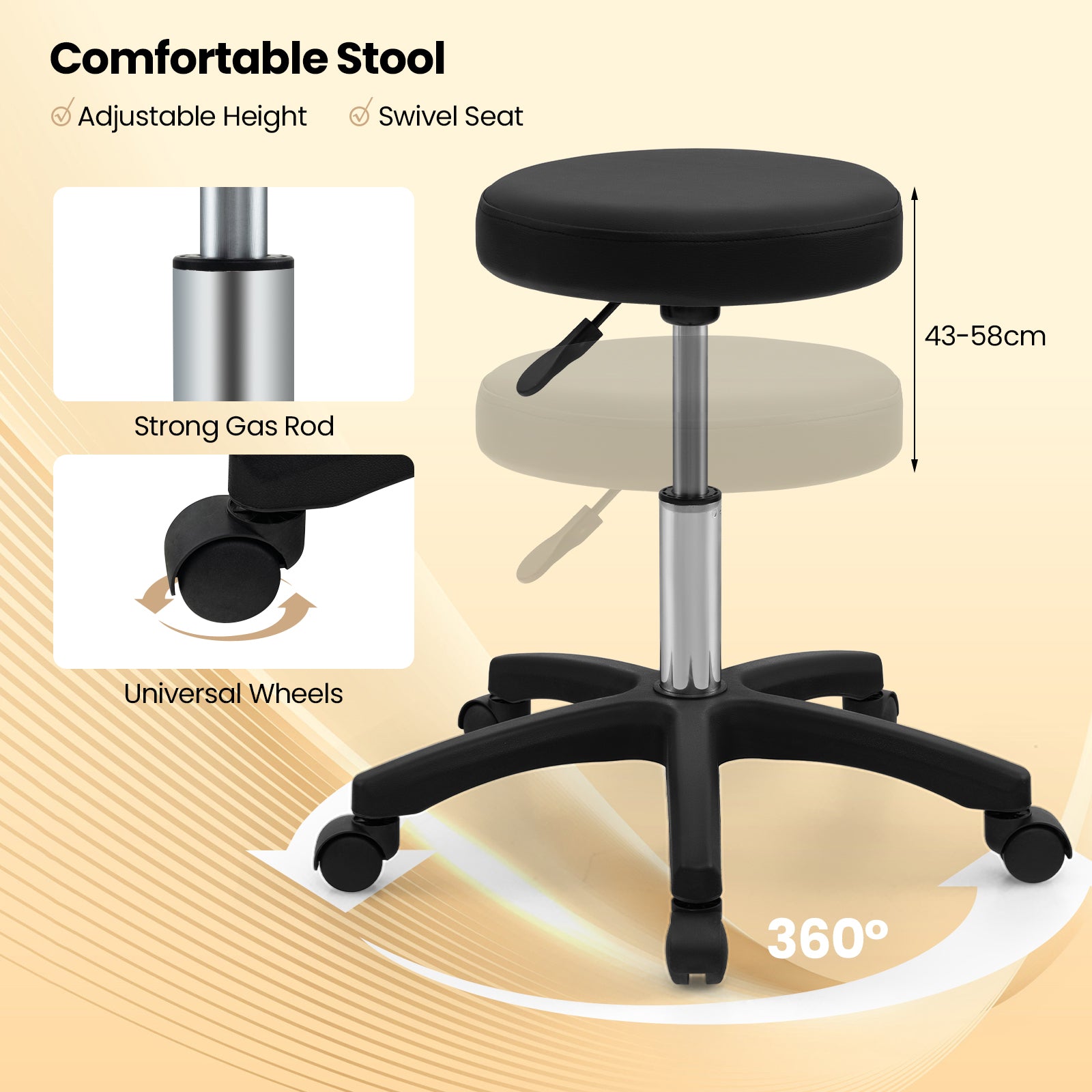 ● 7-postion backrest and 7-position legrest to bring more flexibility● Premium PVC leather is skin-friendly tear-proof and easy-to-clean● Filled with high-density sponge that is ultra-soft and durable● Comfortable stool with a cozy padding design for soft touch● Offers an adjustable height for people of different heights● Has a strong gas rod to stably support the 360° swivel seat● Comes with 5 universal wheels making movement a breeze● Detachable pillow enables you to find a breathing hole for massage● Zippered pillow cover is conveniently removable for cleanup● Has removable padded armrests to get closer to the guests for better service● Dual removable storage boxes for tools gloves cosmetics and towels● Designed with anti-falling baffles to keep storage boxes in place● High-resilience springs and multi-gear adjustment lever for easy adjustment● Concave surfaces ergonomically adapt to body curves● Widened metal supporters build a wobble-free lying platform● Adjustable foot pads always maintain great stability● Versatile applications become the best partner in your work Installation guide