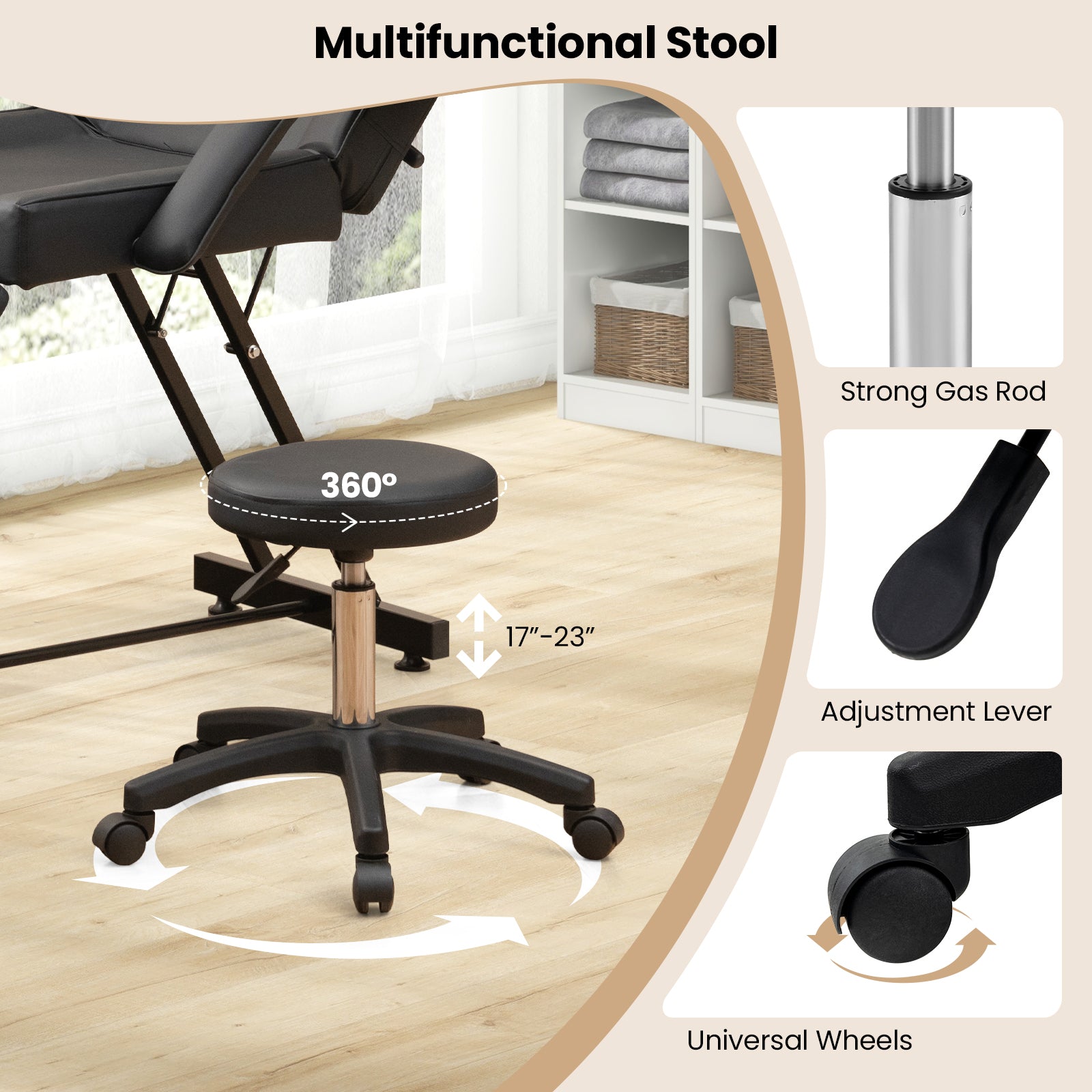 ● Has a 7-position backrest to provide ergonomic support● Guests can lie down comfortably with the 7-position legrest● Heavy-duty metal tubes make it rustproof and high-strength● Made of skin-friendly PVC leather and ultra-soft sponge● Remove armrests to get closer to guests to perfectly handle details● Remove pillow to get a breathing hole for massage posture● With a 360° swivel seat for easy access to items in different directions● Designed with a strong gas rod to safeguard the stable lifting● Features universal wheels making easy movement a reality● Convenient towel rack to keep your towels within arm's reach● Adjustable foot pads to stabilize the whole construction● Zippered pillow cover only requires effortless maintenance● Allows for easy adjustment thanks to the dual side control levers● Adjustment lever makes it easy to adjust the stool height● Cozy concave surfaces for ergonomic adaption to your body curves● Perfect for SPA facial massage tattoo head massage and foot massage Installation guide