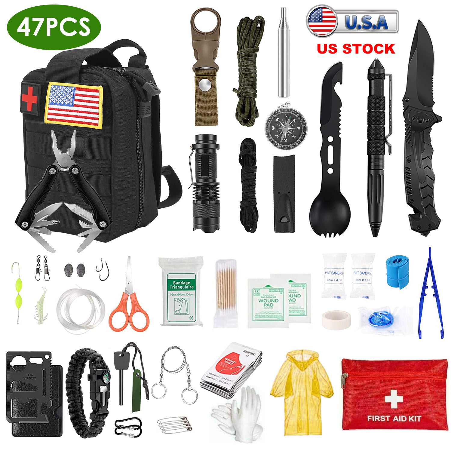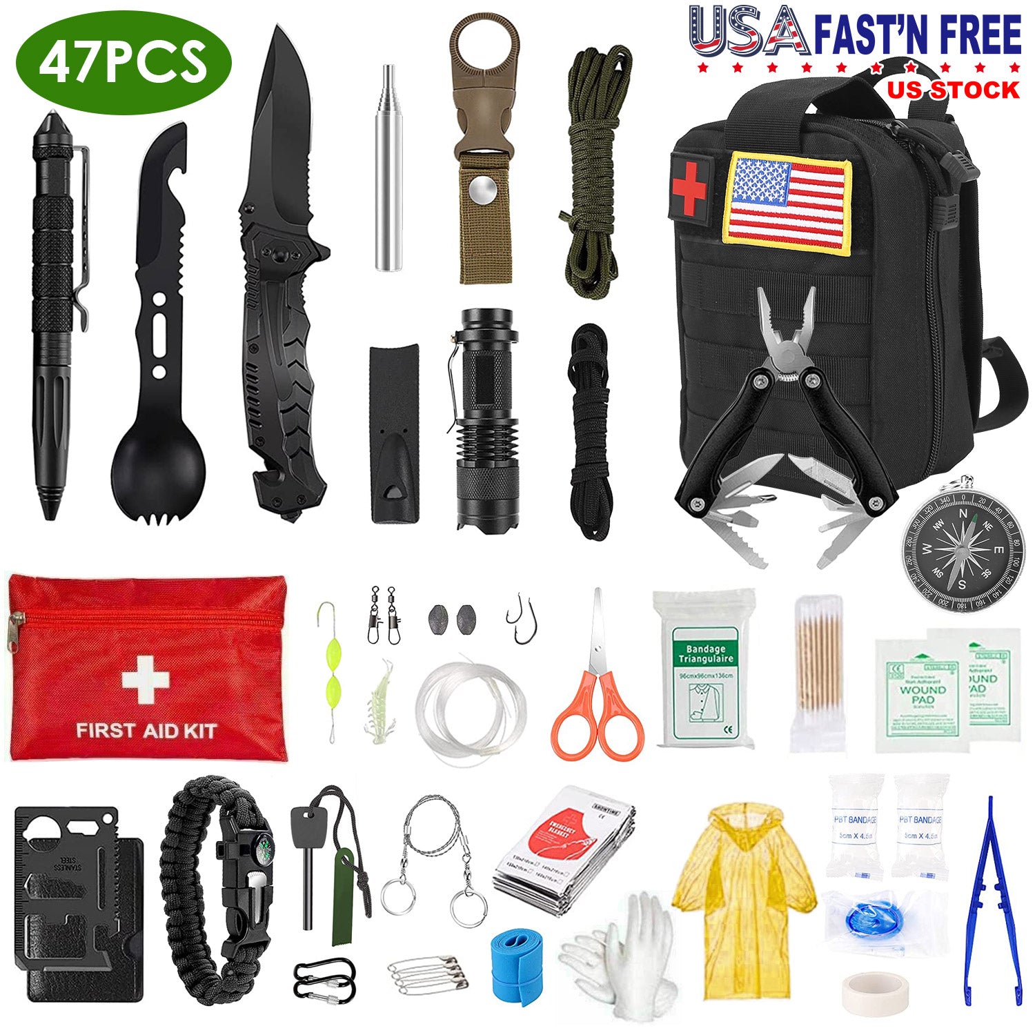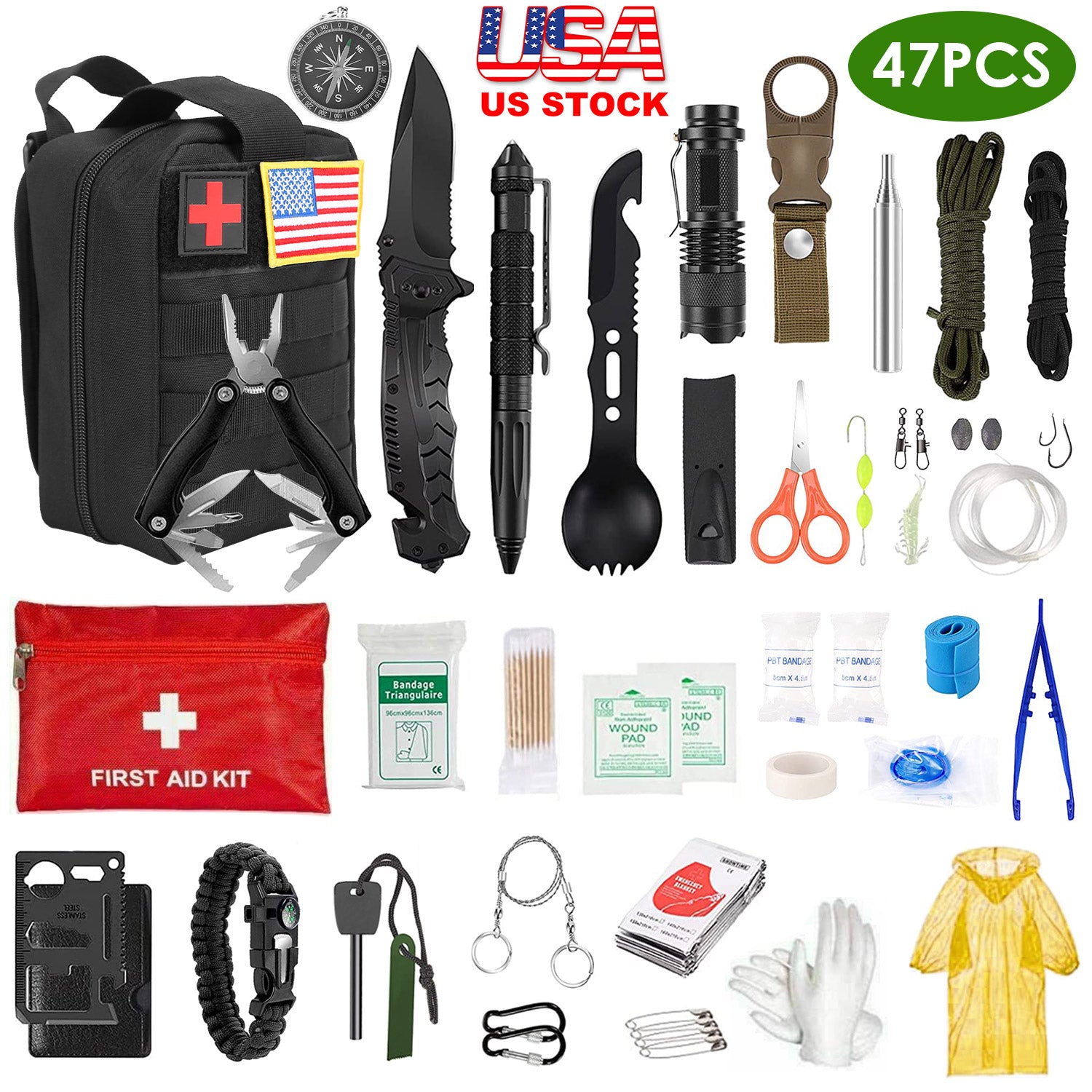 47Pcs Emergency Survival Kit Survival EDC Gear Equipment Tool First Aid Supplies Kit Tools with Pouch for Hiking Hunting Disaster Camping Adventure