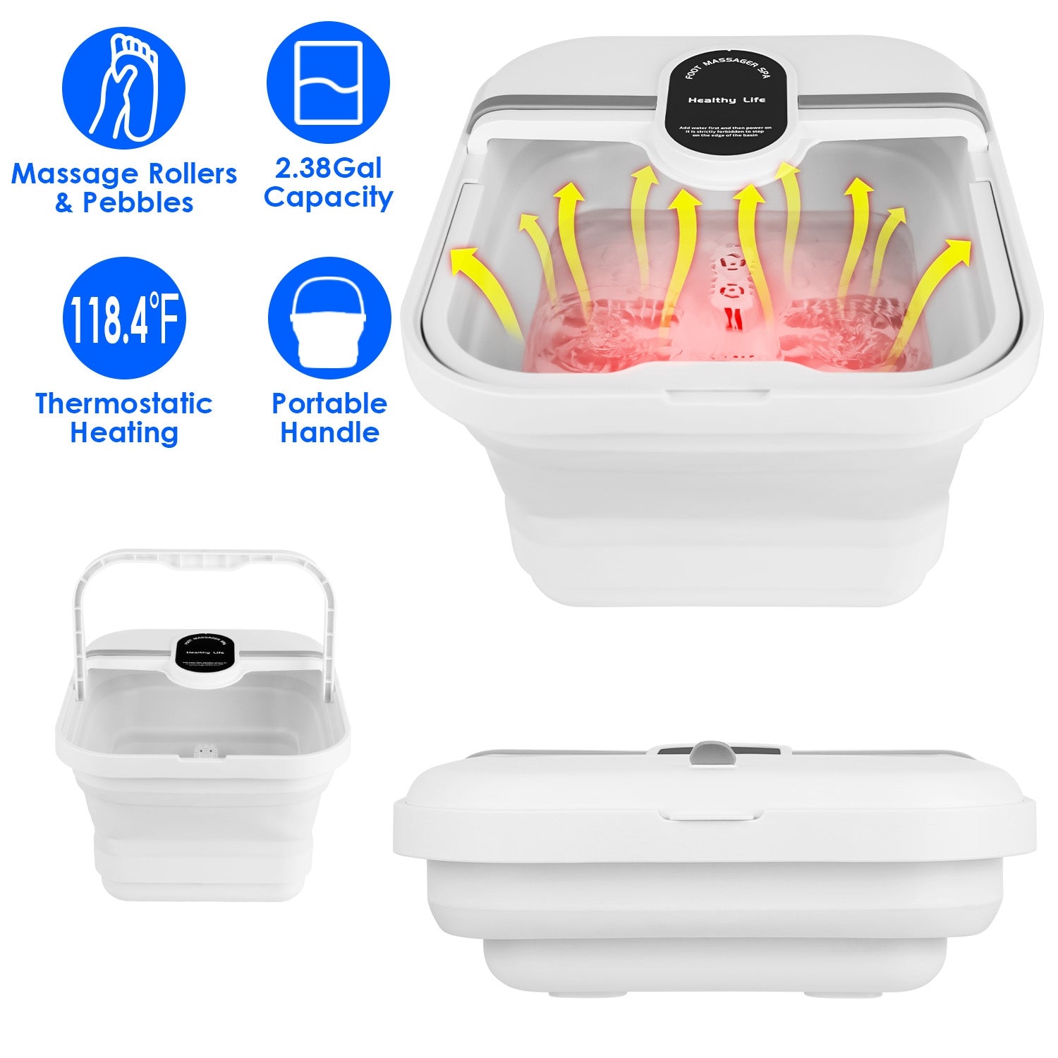 After a hard day\'s work, it\'s great to take a foot bath to relax yourself! Our electric foot bath tub is a great choice for you. Equipped with thermostatic heating function, 8 rollers and 44 simulated pebbles on the bottom, you can massage your foot during foot bath. Perfect for relaxing in the evening, reading or watching a movie. When not in use, it can be folded up to store under the sofa/bed, which is super space-saving. Collapsible handle makes it easy to carry from one room to another room. A perfect gift to take care of the health of your whole family! They will love the experience of foot massaging!