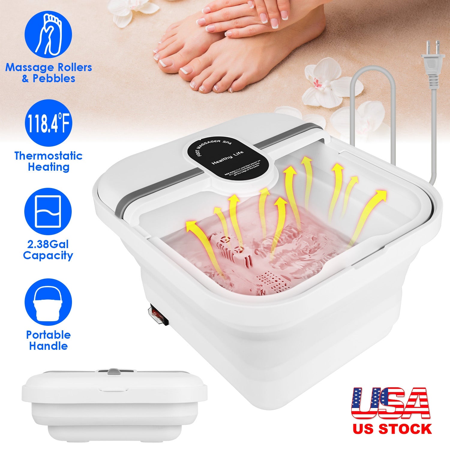 Collapsible Foot Spa Massager Electric Foot Soaker Tub Foldable Foot Spa Tub with Heating Function Handle 8Pcs Massage Rollers 44Pcs Simulated Pebbles