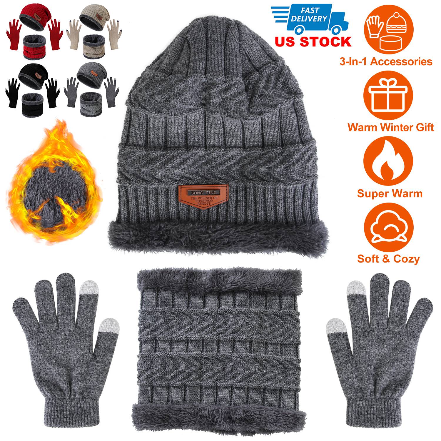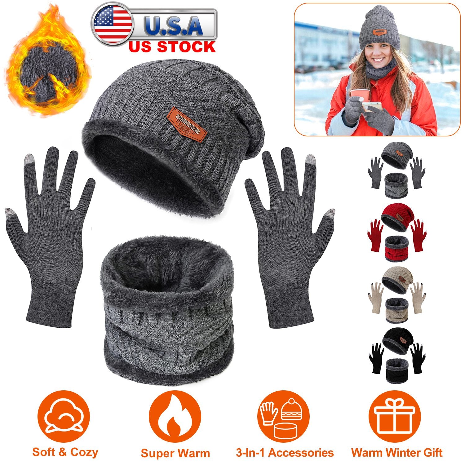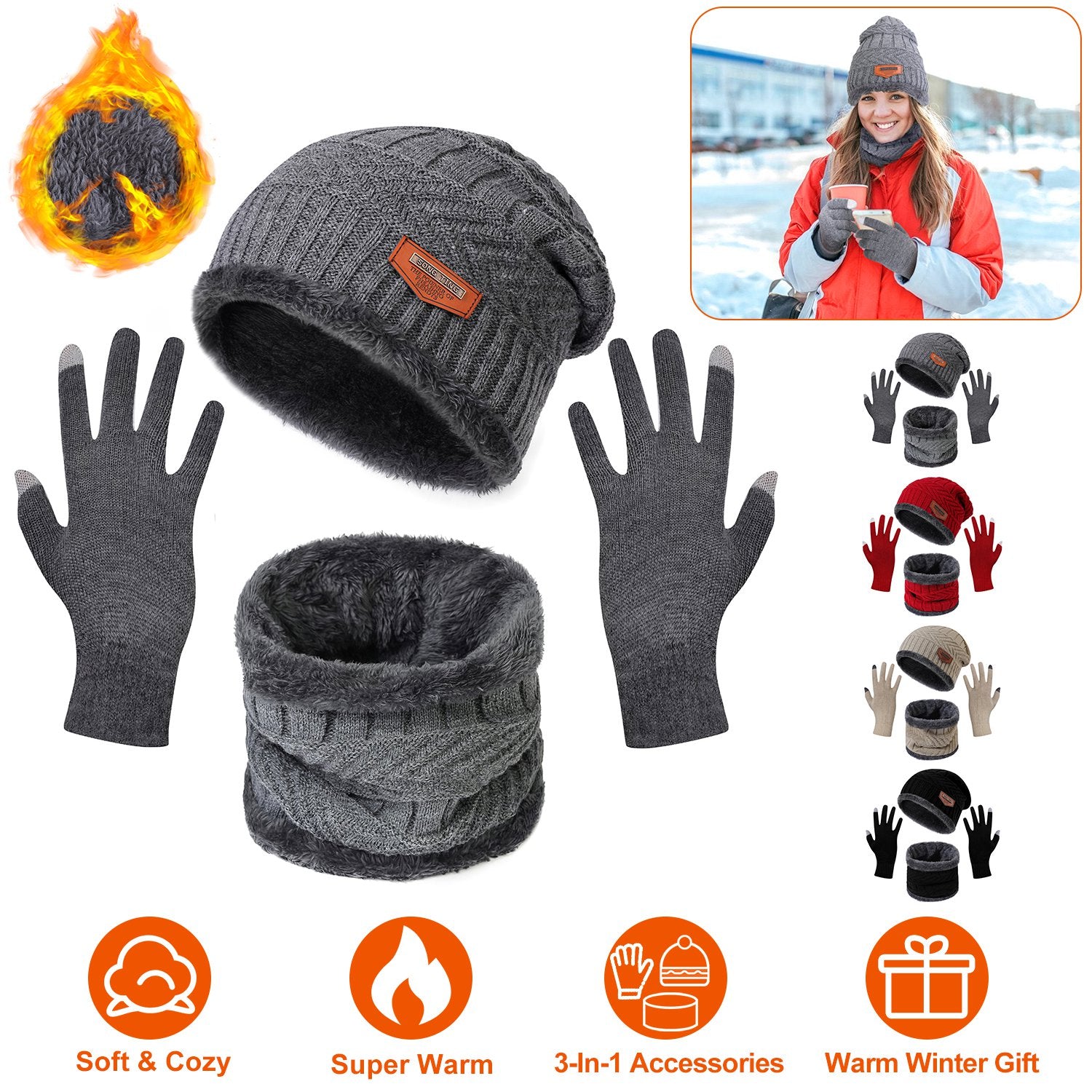Skin-friendly stretchy knitting acrylic and soft fleece lining and the two layer design allow our beanie and scarf set to keep your head, ears, face and neck warm, ideal for walking, running, hiking, etc.. Besides, screen touchable gloves allow you to use your phone even wearing the gloves, keeping your hands warm while playing games on the phone/tablet in chill winter. You can also wear them separately as you want to fit your various styles! A sweet gift for your friends, parents as birthdays, Christmas gift in cold winter! 4 Colors are provided for you to choose.