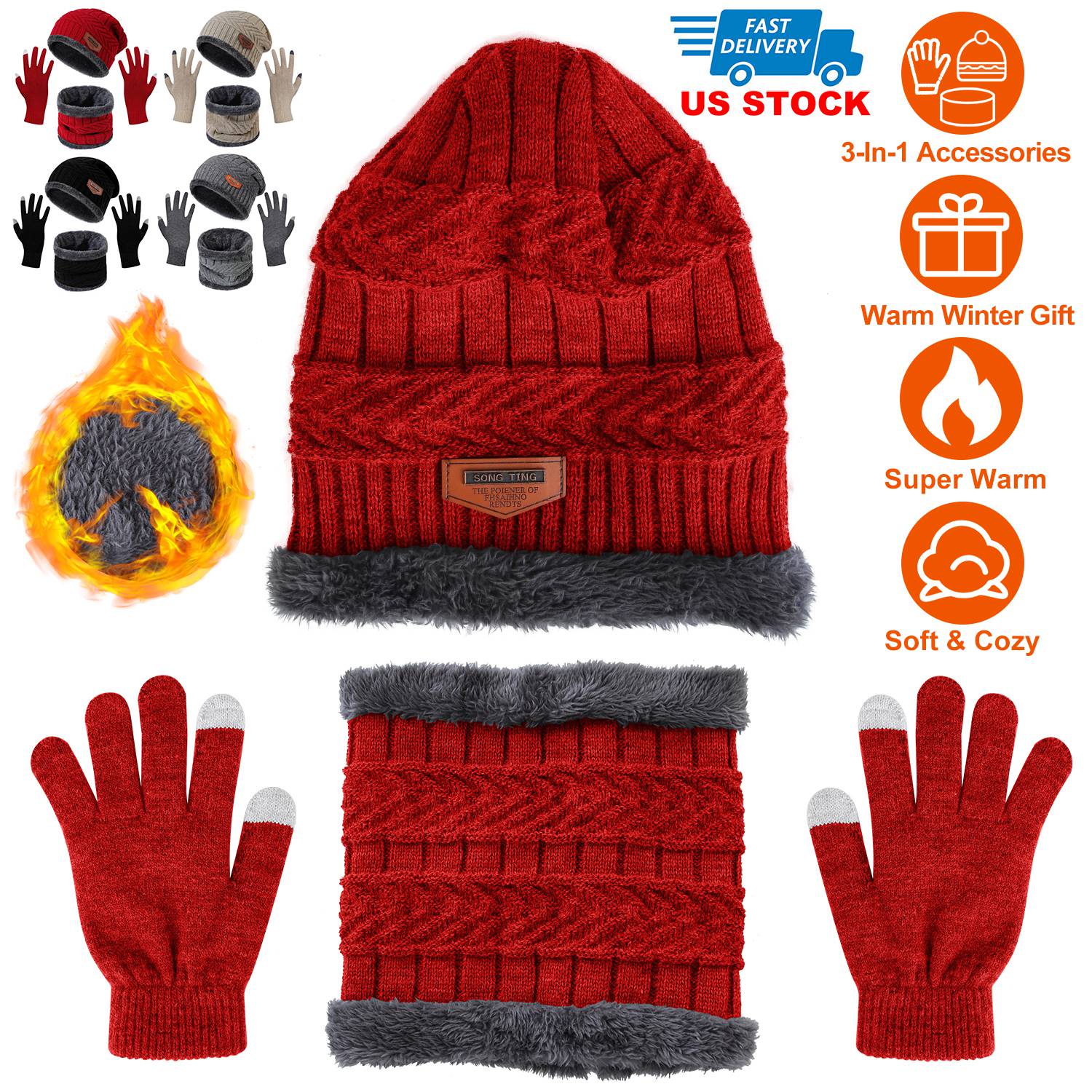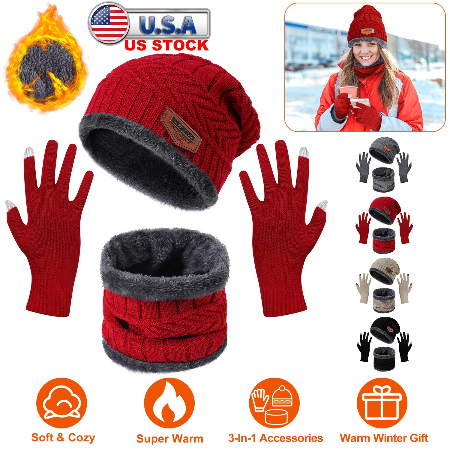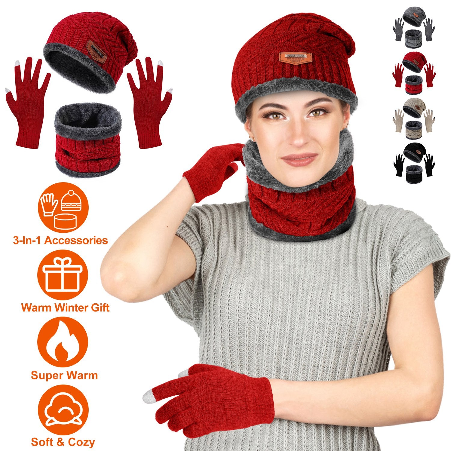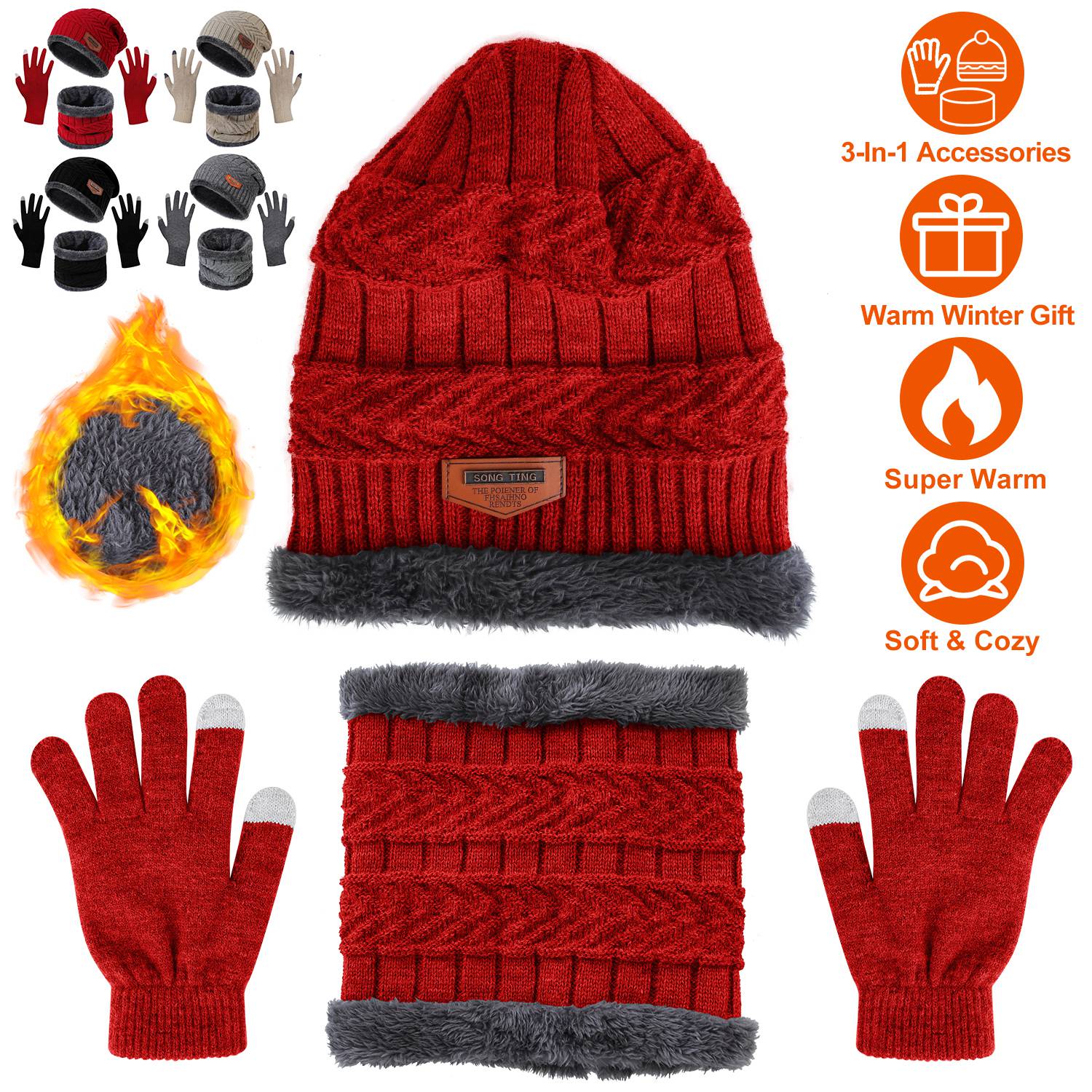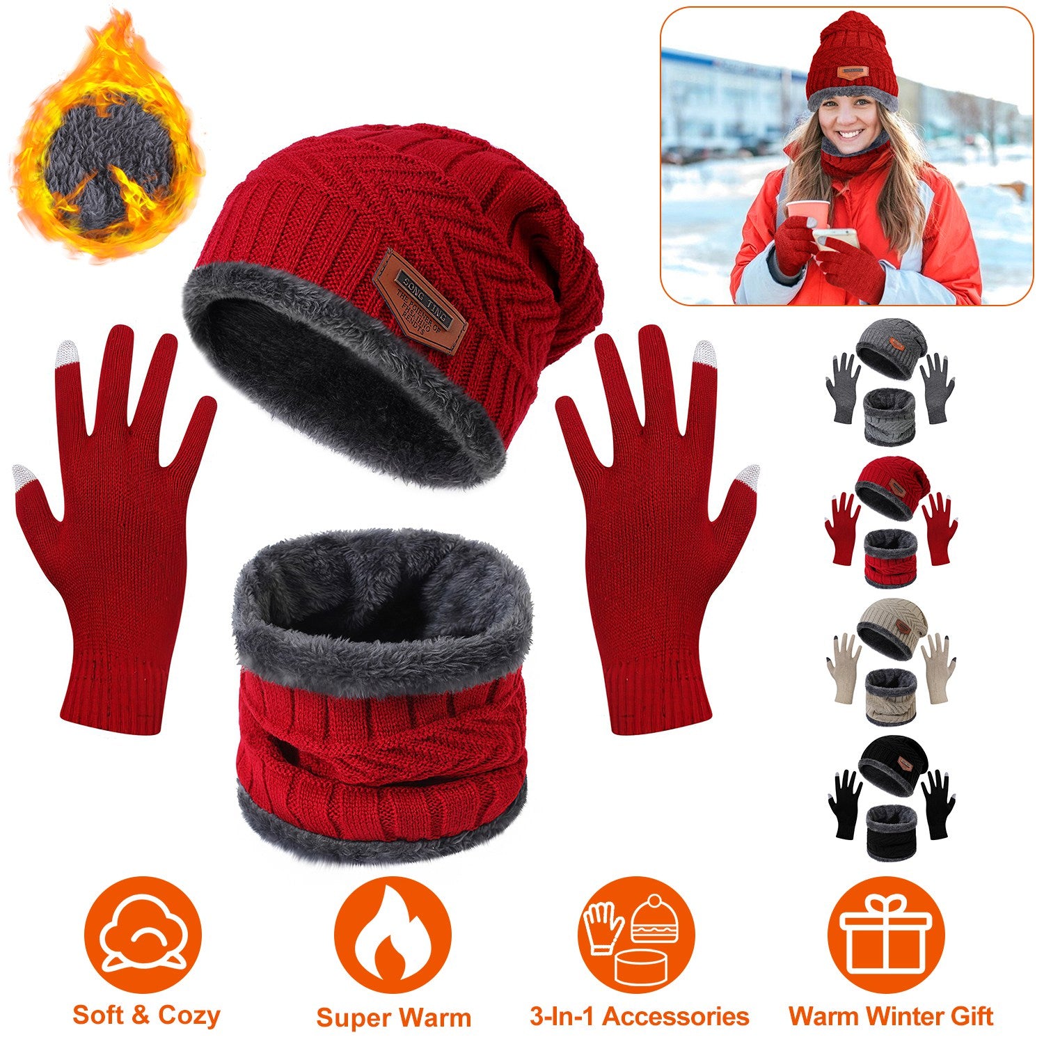 Winter Knitted Hat Scarf Gloves 3Pcs Winter Warm Beanie and Touch Screen Gloves Scarf Set Knit Beanie Skull Cap Neck Warmer Mittens for Men Women