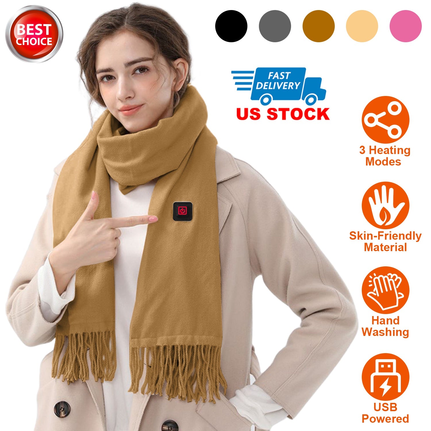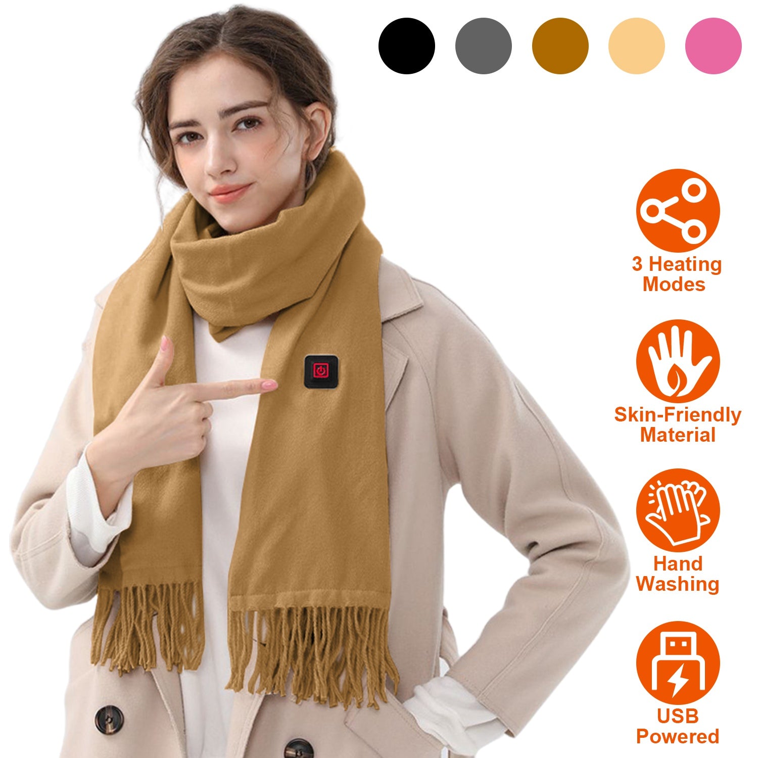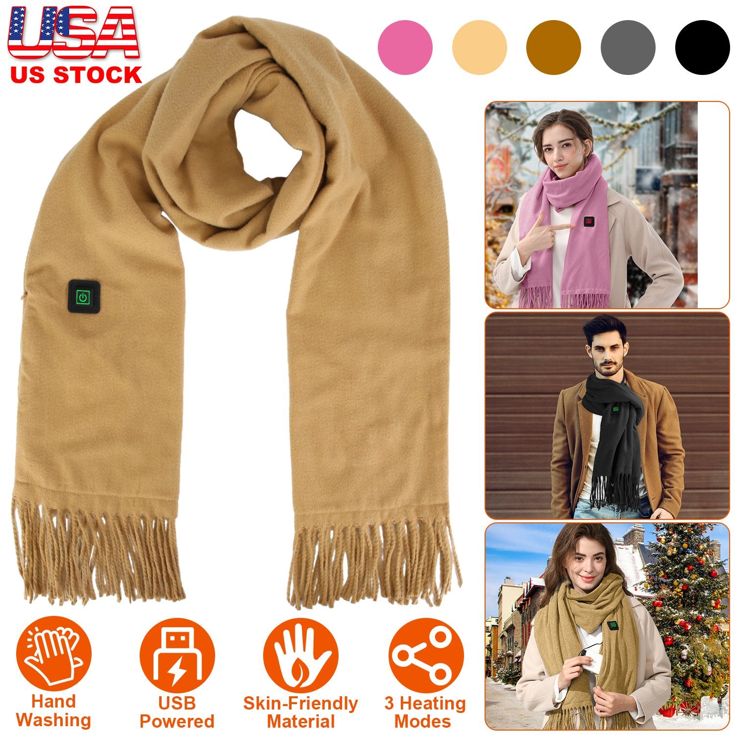Our electric heated scarf is the sweetest partner for you in this cold winter! Powered by USB port power bank, our scarf comes with 5 optional colors and 3 temperature settings, you can flexibly choose according to your preference and environment. Made of soft and skin-friendly artificial wool, provide you most warmth and comfortable wearing experience anytime anywhere. An ideal gift to show your love and concern for your friends and family.
