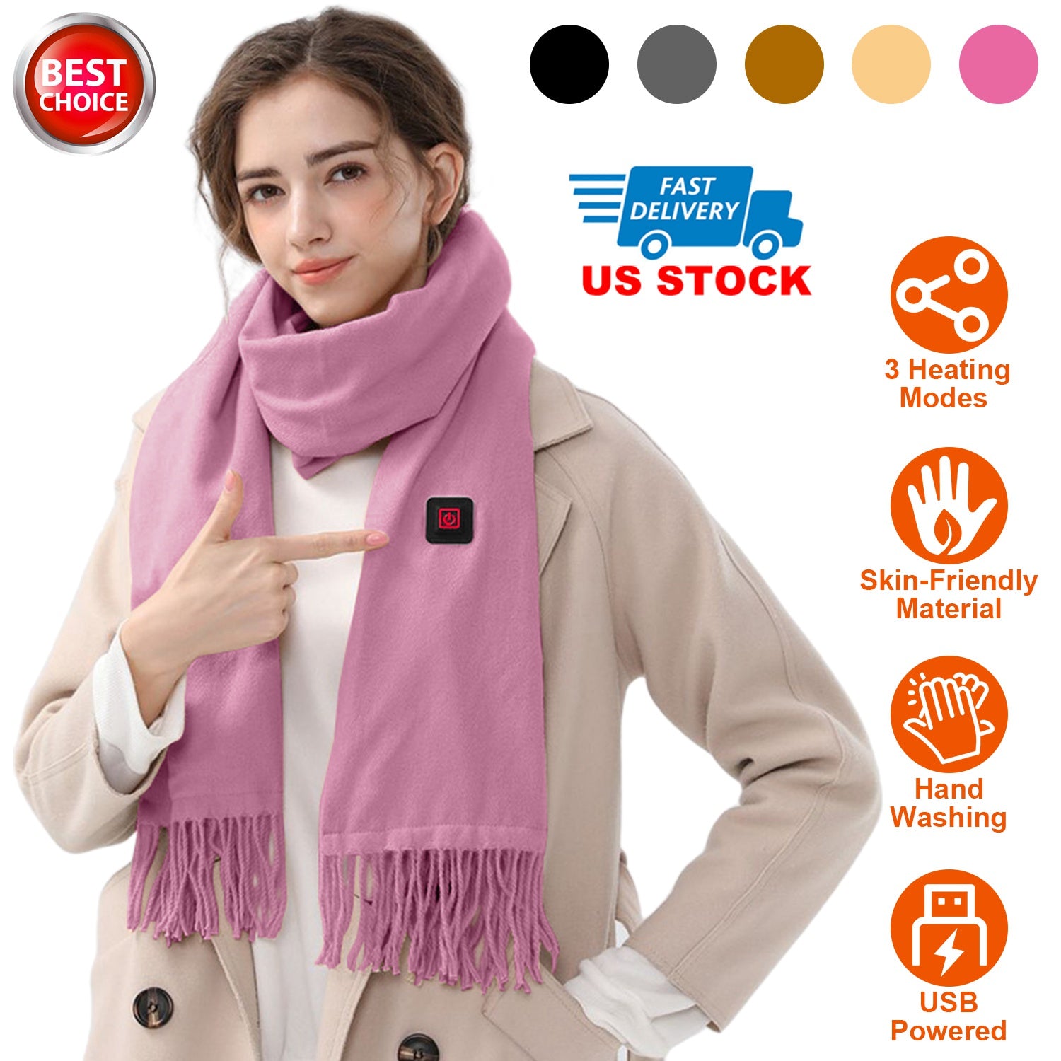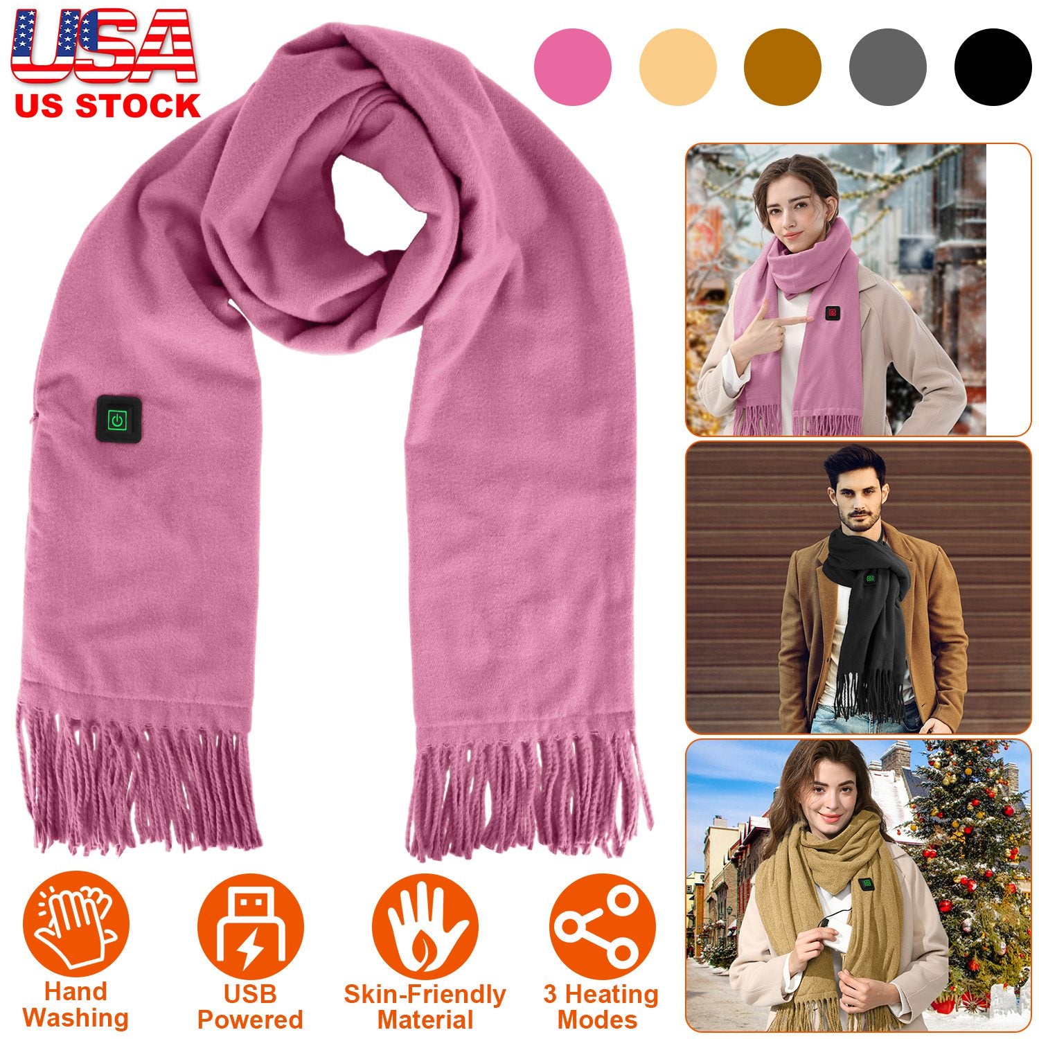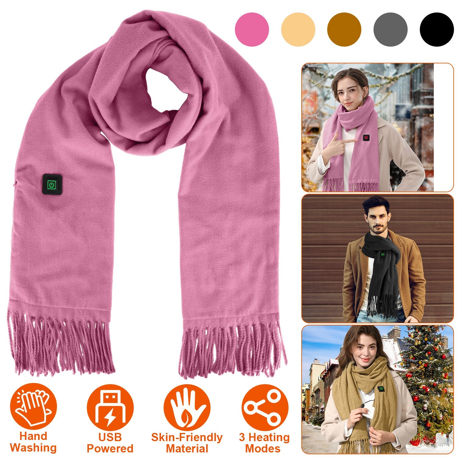 Our electric heated scarf is the sweetest partner for you in this cold winter! Powered by USB port power bank, our scarf comes with 5 optional colors and 3 temperature settings, you can flexibly choose according to your preference and environment. Made of soft and skin-friendly artificial wool, provide you most warmth and comfortable wearing experience anytime anywhere. An ideal gift to show your love and concern for your friends and family.