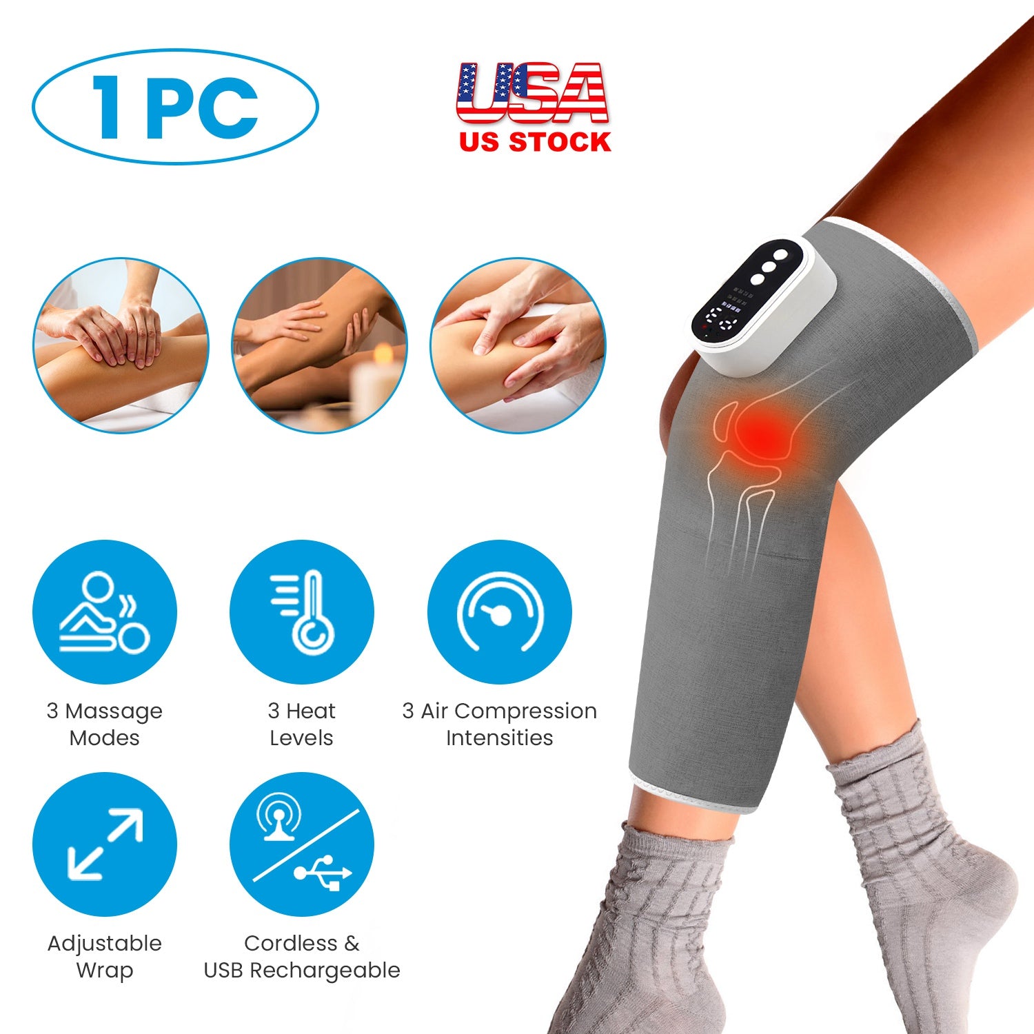 Cordless Leg Massager Air Compression Massager with Heat Thigh Knee Calf Massager with 3 Modes Adjustable Wrap for Pain Relief