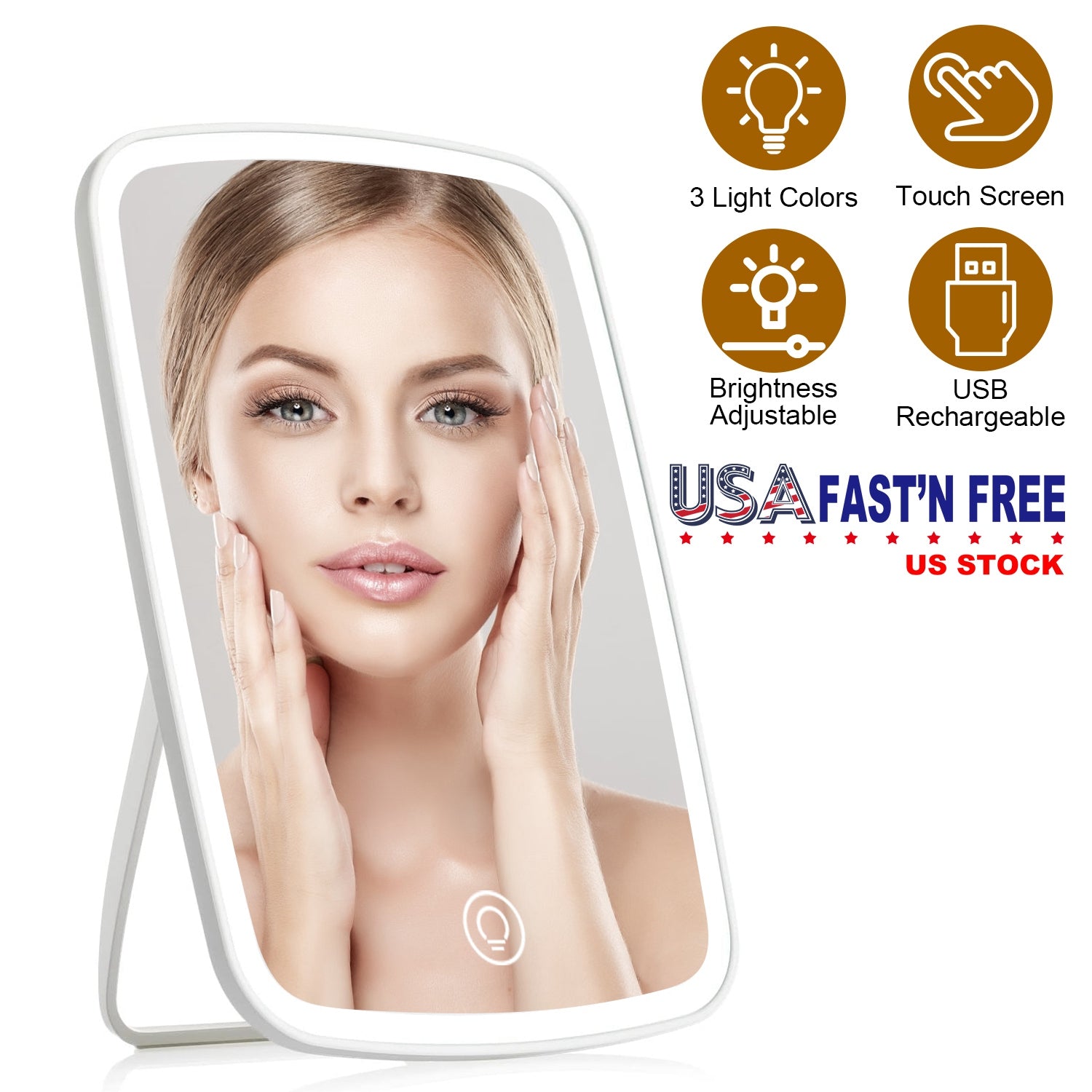 Unsatisfied with your mirror that brings distortion and bad viewing effect? Our Lighted makeup mirror can definitely surprise you with its 3 beautiful light colors. Endowed with 40 bright LED beads and stepless dimming setup, our vanity mirror resembles natural daylight and eliminates harsh shadows for you, ensuring that your makeup application is even and well-blended. With built-in 800mAh rechargeable battery and USB powered feature, our desk mirror can also be a portable mirror for travelling. Switch between different light modes effortlessly with smart touch control. The folding bracket enables you to get the best viewing angle from 0º to 120º. A thoughtful gift for wife, girlfriend, mother, sister, friends and makeup artists etc., especially a perfect gift choice for Valentine’s Day!