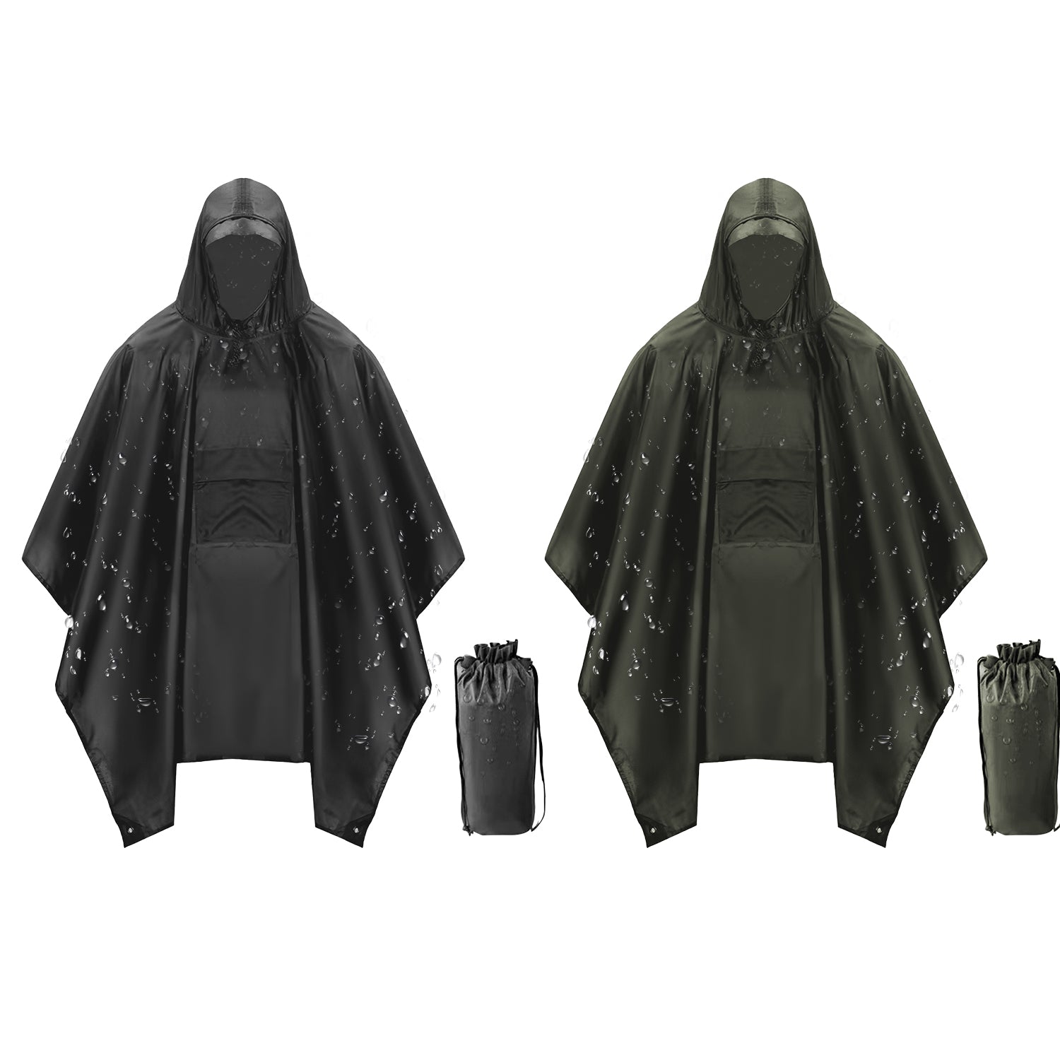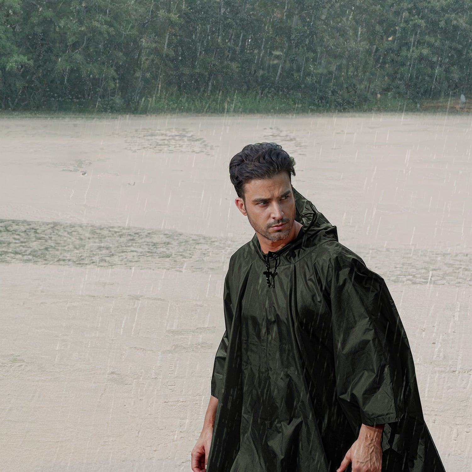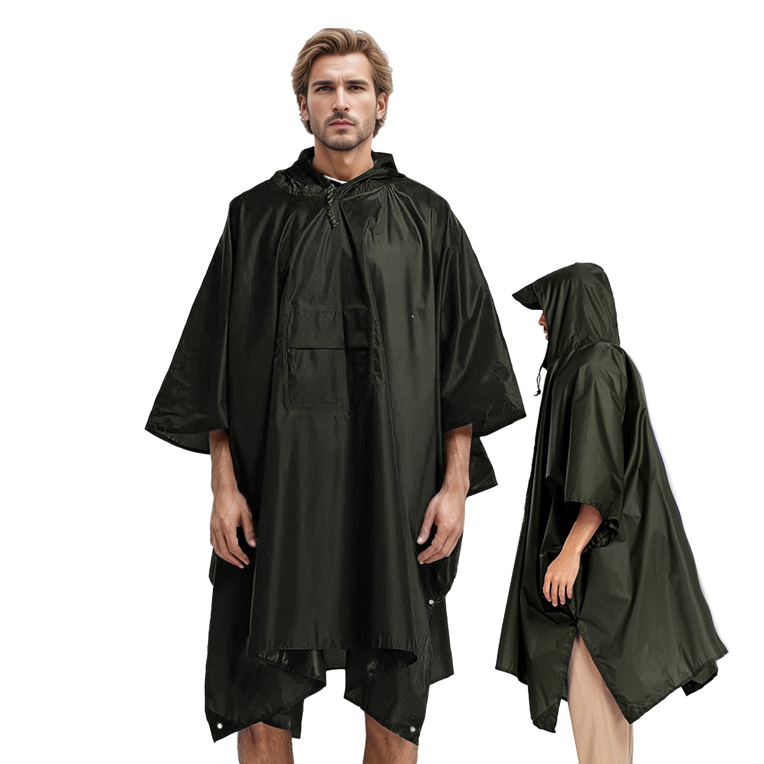 Our unisex hooded rain poncho, with a size of 6.88x4.59ft, fits teenagers, men and women perfectly. The generous dimensions provide large cover area to protect your body and backpack, keeping you dry and safe in heavy downpours. Made of premium 210T polyester with PU coating, this adult rain poncho has excellent waterproof performance (5000+MM) and is sturdy, tear-resistant and breathable. It also features a front pocket for small essentials, a spacious hood with drawstring, snaps on both sides for maximum comfort. 3-in-1 Functional adult rain poncho can also serve as temporary tent or camping tarp, portable for any outdoor activities, like camping, hiking, fishing and more.