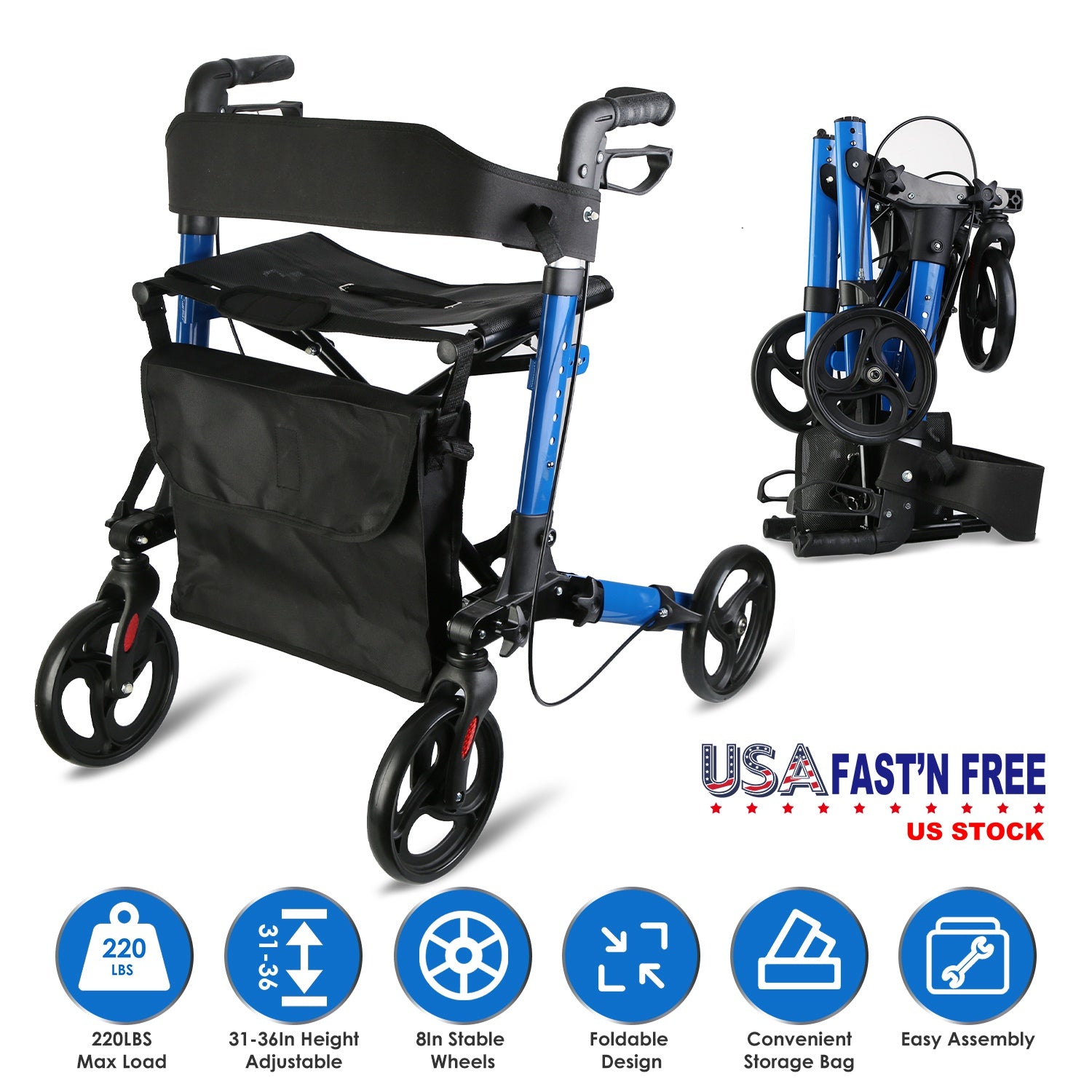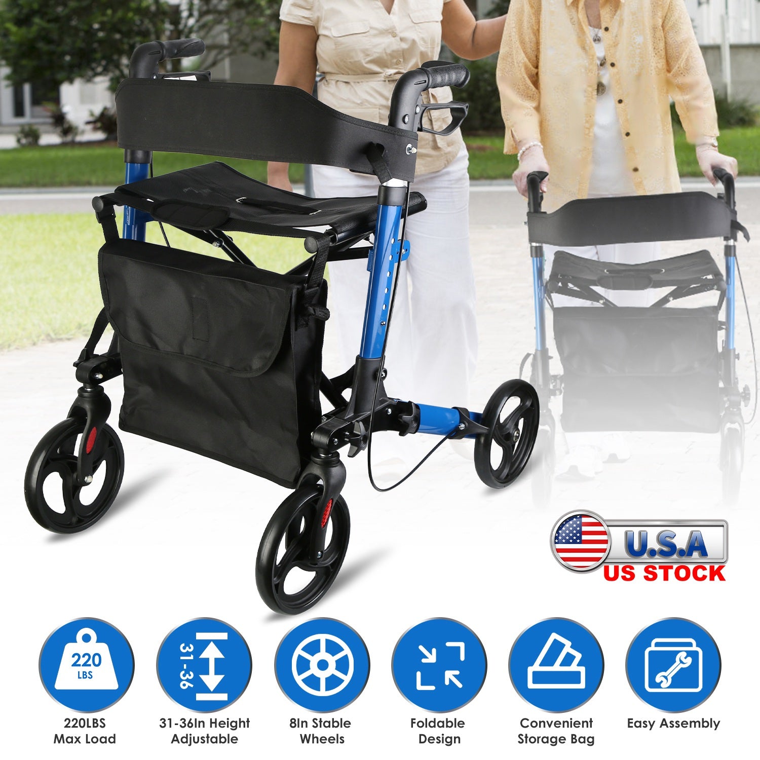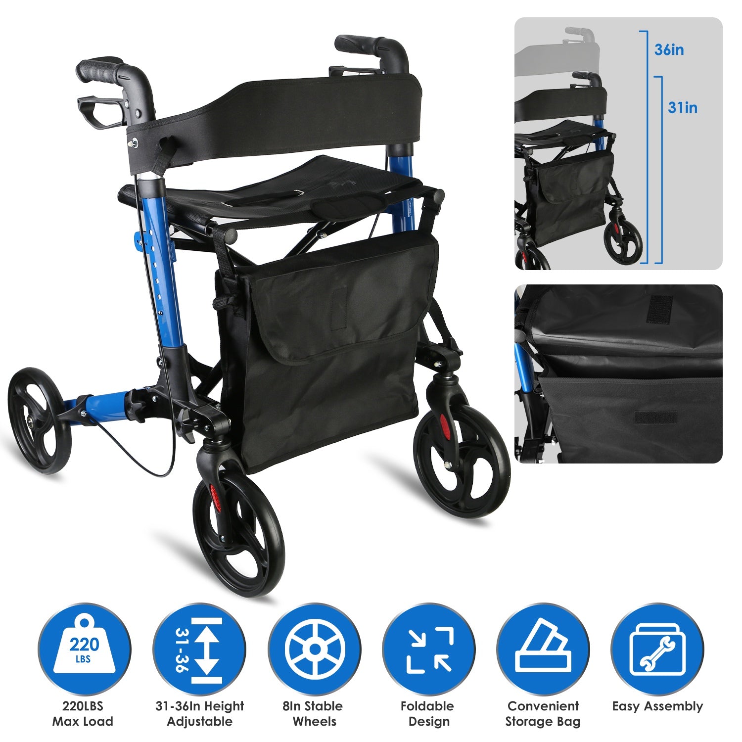 Aluminum Rollator Walker with Seat Backrest Foldable Rolling Walker with 220LBS Max Load 31-36in Adjustable Height 8in Wheels for Seniors Adult Mobili