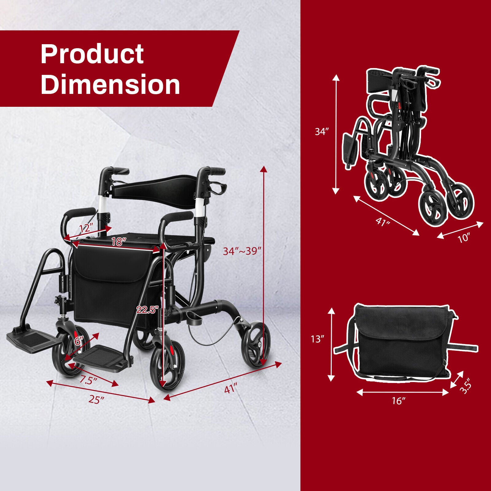 ● Aluminum frame makes it steady and durable and support up to 350 lbs● X-shaped structure adds extra stability for great safety● 6 handle heights available for people having diverse needs● Fold to a compact size for easy storage and transportation● Equipped with comfortable seat with soft padded armrests● The holder on the left side can place your umbrella or cane● Handbrakes to quickly and safely control and lock the rollator● Comes with a large storage bag for carrying your accessories● Wear-resistant and shock-absorbing Wheels can conquer various terrains● Help the people who has less mobility to move● Used as a transport chair by adjusting the backrest and footrest