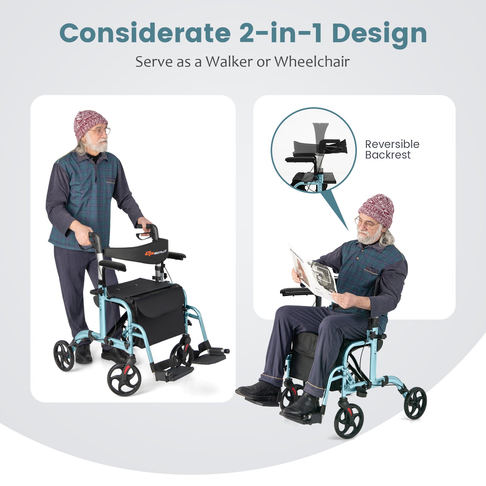 ● 2-in-1 rollator can be used as a walking aid and a wheelchair as you like● 6 adjustable heights fit users of various heights for better use experience● Dual hand brakes can achieve controlling speed and parking as needed● Folding footrests with a buckle can save space when not in use● Aluminum alloy structure for high stability and durability● X-shaped frame can load up to 300lbs and ensure its safety● Storage bag and umbrella/cane holder make hanging out more effortless● 8" wheels suitable for rolling smoothly on multiple terrains● One-hand folding design for easy carrying and storage● Soft padded armrest for being a comfortable place to put hands