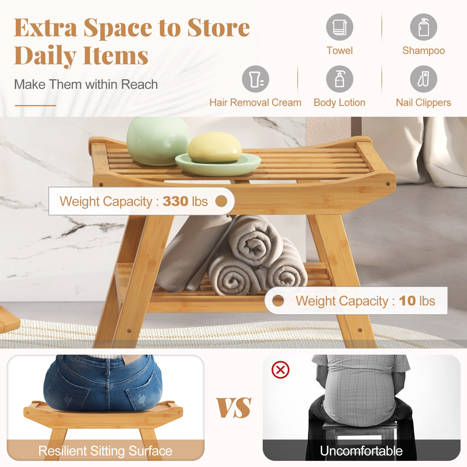 Bamboo Shower Seat Bench with Underneath Storage Shelf-Natural