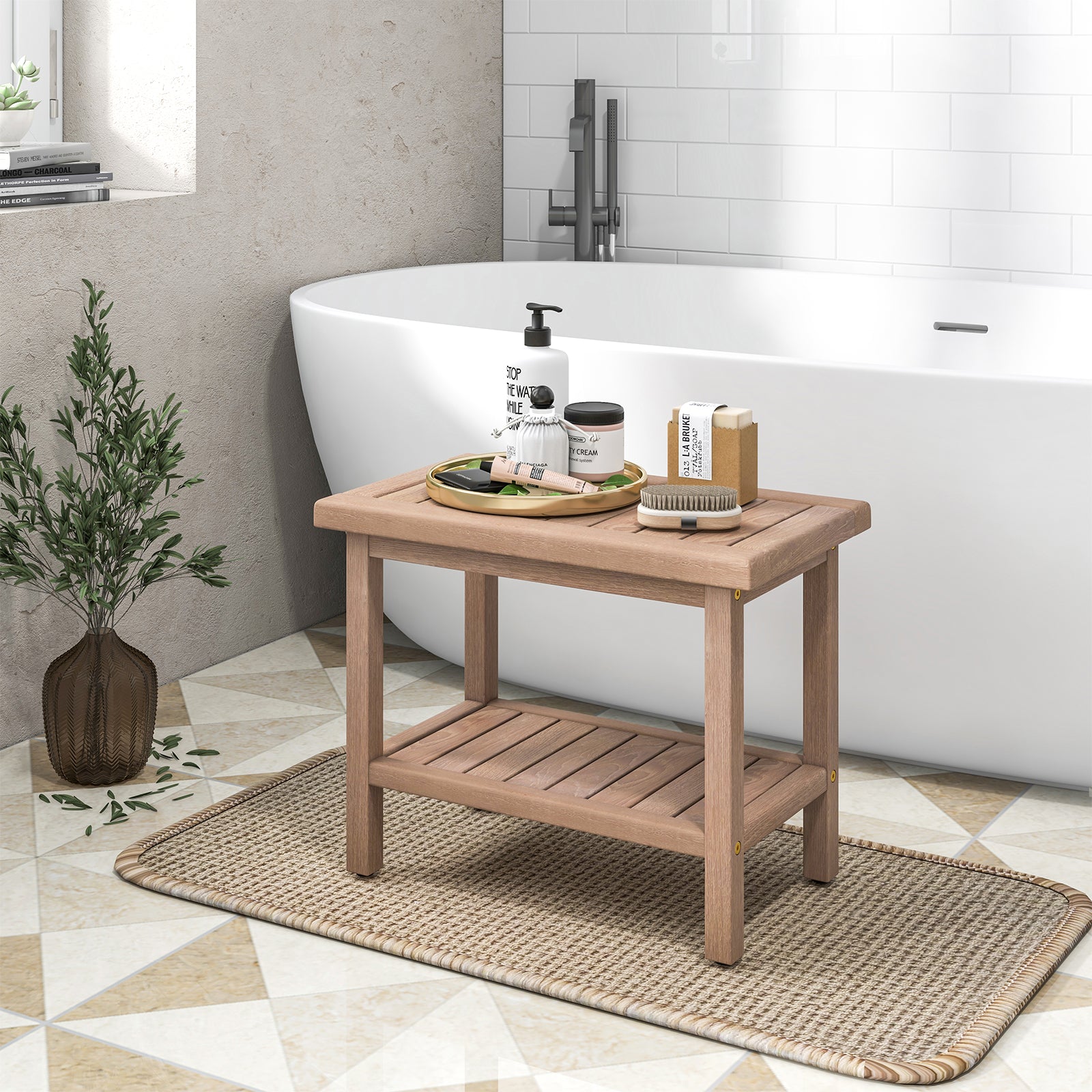 ● 2-tier storage shelf for a variety of bath items ● Natural teak wood for great water and wear resistance ● Robust construction for large load-bearing capacity ● Ventilated slat design avoids water accumulation ● Reinforced connection for extra sturdiness ● Non-slip rubber foot pads for added stability ● Suitable for both indoor and outdoor use ● Serves as a bath stool storage shelf side table etc ● Detailed user's manual for easy assembly ● Waterproof surface for simple maintenance