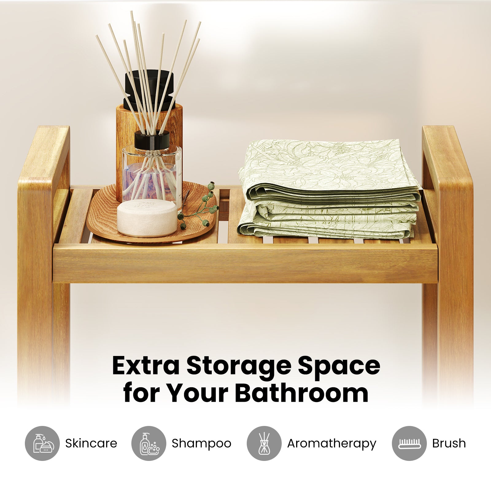 ● Crafted from 100% natural teak wood for a solid structure● Water-resistant paint for durability in humid environments● Provides extra storage space for your bathroom● Slat bench top ensures quick water drainage● Dual side handles allow for easy movement● Versatile bench can be used as a shower stool storage bench or extra seat● Stylish and simplistic appearance lights up your home● Assembly needed with clear instruction