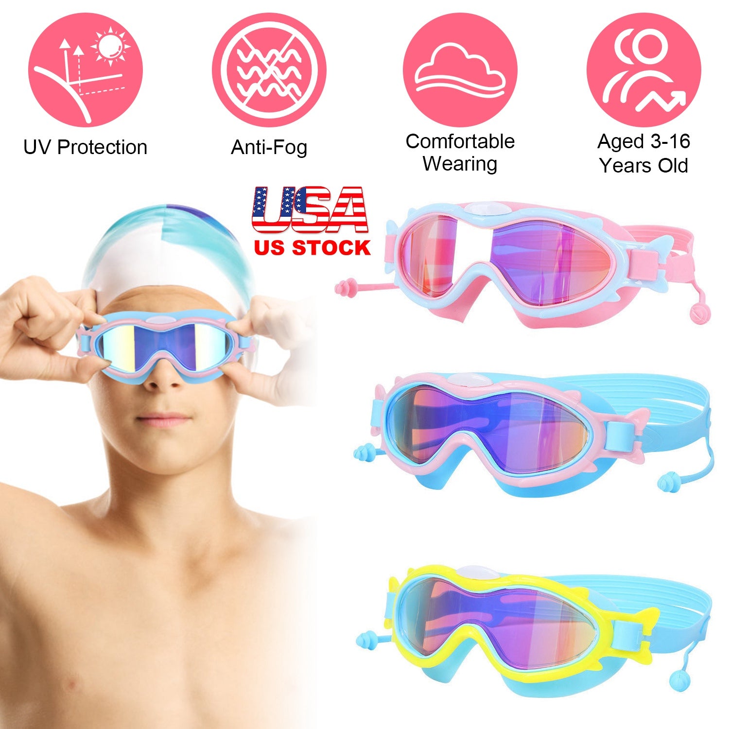 Available in 3 vibrant colors, these swim goggles are specifically designed for children and teenagers aged 3 to 16. Equipped with soft silicone straps that accommodate various facial shapes, our ergonomic goggles offer maximum comfort. The well-sealing silicone provides excellent waterproof performance. Treated with advanced anti-fog and UV-protection coating, these goggles deliver clear underwater vision while safeguarding children\'s delicate eyes from harsh sunlight. Additional ear plugs offer comprehensive protection for your child\'s ears. The ideal accessory for swimming lessons, water parks, beaches, or pool parties in this summer.