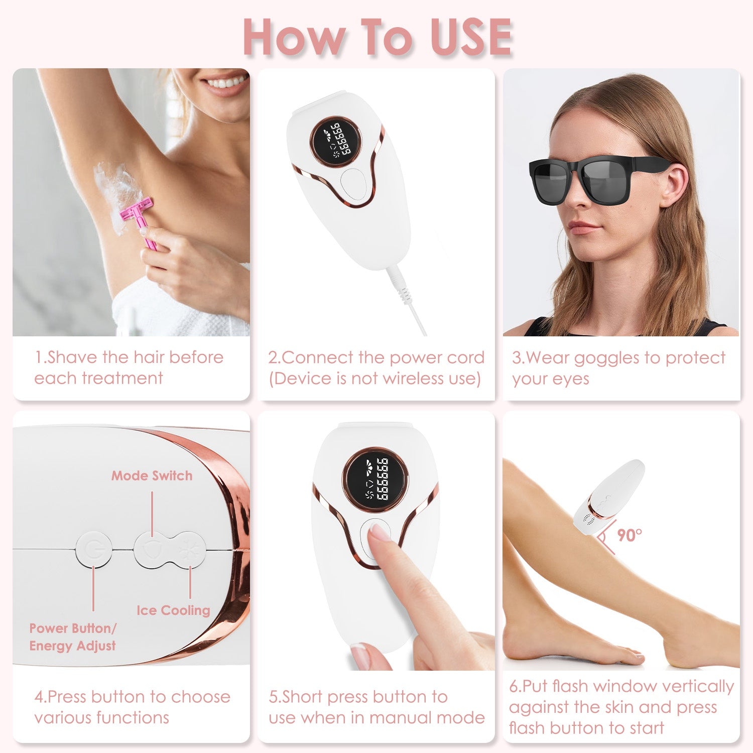 This advanced IPL hair removal device utilizes cutting-edge technology to effectively disrupt the hair regrowth cycle, delivering permanent hair removal results with smooth, hair-free skin after about 9 weeks of consistent use. Featuring five adjustable energy levels, an ice cooling system, and 999,999 flashes, it offers a personalized and pain-free experience. Designed for full-body use, it provides an economical, salon-quality solution for permanent hair removal at home.