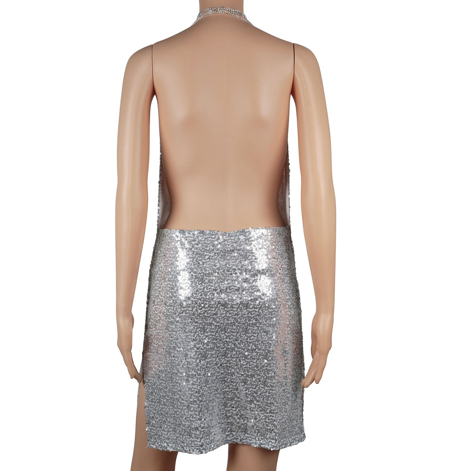 Sexy Women Chain Choker Side Slit Backless Slip Dress With Sequins