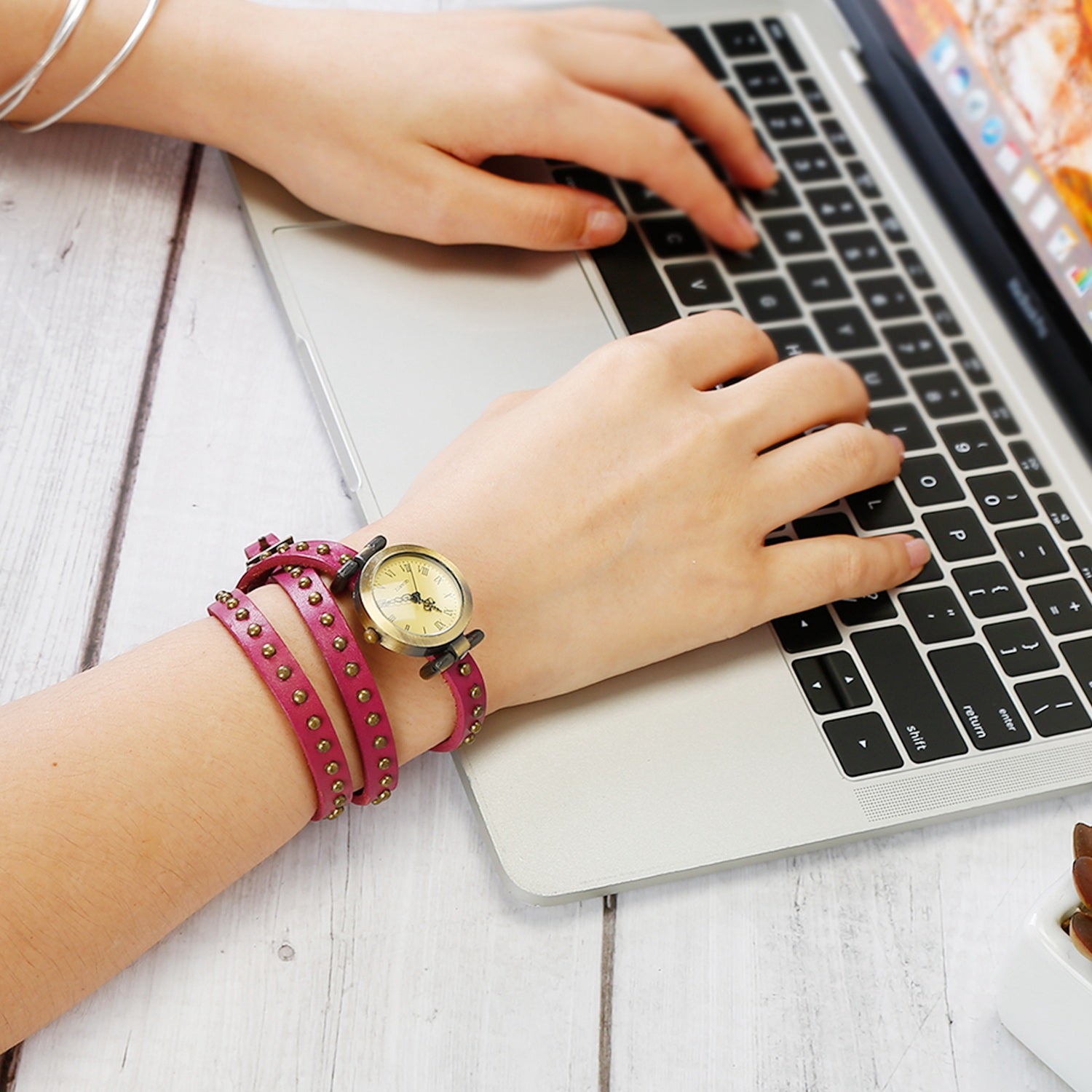 Fashionable Rivet Leather Belt Retro Watch Hand Chain-pink