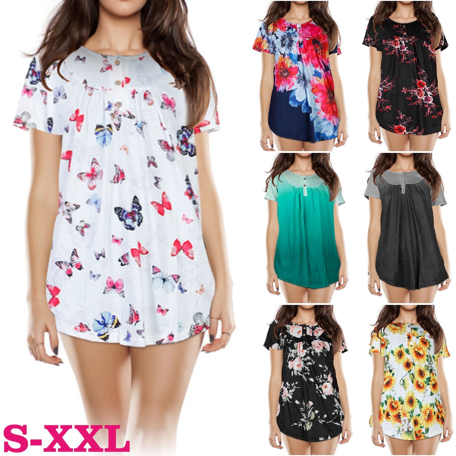 Women Summer Shirts Tops Loose Short Sleeve T Shirts Casual Floral Printed Button Shirts Blouse S-XXL