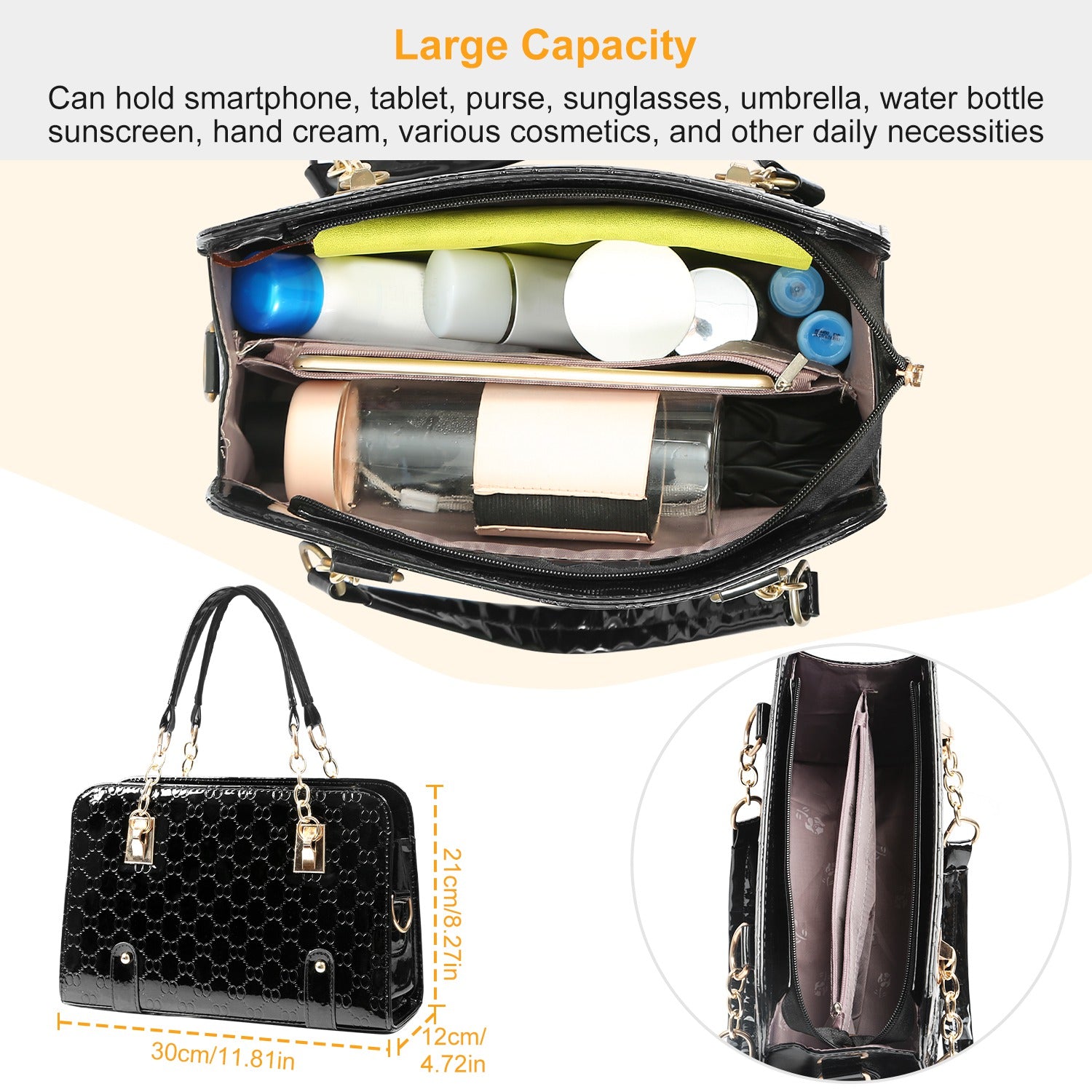 This elegant black handbag is crafted from premium leather with an embossed pattern and gold-tone hardware, combining durability and luxury. Its versatile design and spacious interior make it an ideal choice for daily use or special occasions.